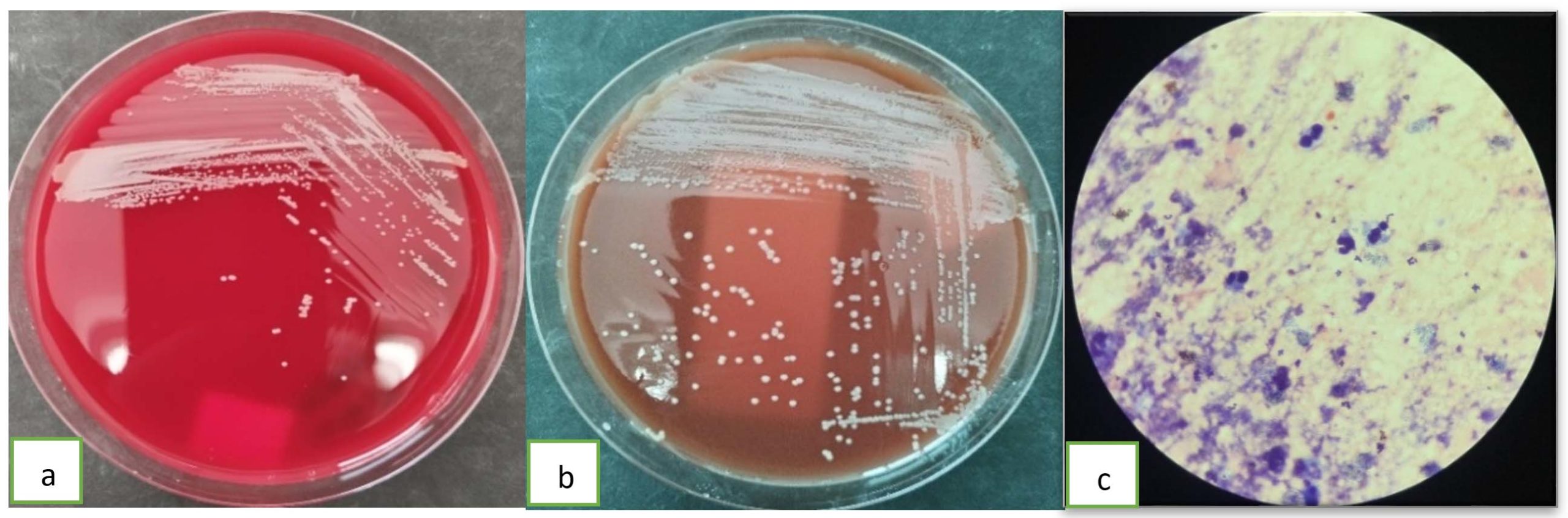 Figure 1. (a). Staphylococcus aureus in blood agar (b). Staphylococcus aureus in chocolate agar, and (c). Staphylococcus aureus in a Gram stain from the patient’s superficial pus cultures