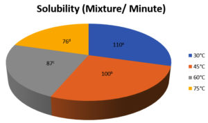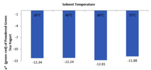 Solvent temperature strongly influences the solubility of a material. The organic components in a material have different solvent temperature thresholds at which they dissolve optimally. Increasing the solvent temperature to 75 °C during the reconstitution of powdered green tea yogurt resulted in the highest solubility, namely 76 stirs/minute.