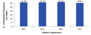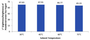 The range of L* values in this study was 65.33-67.91. Based on the results of the analysis of variance, the use of different solvent temperatures did not significantly affect the L (brightness) value of reconstituted green tea yogurt.* This indicates that employing a range of solvent temperatures does not change the L* color value of yogurt.