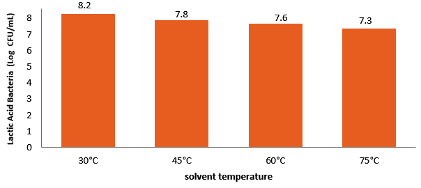 Based on the analysis of variance, the use of different solvent temperatures had no significant effect (p > 0.05) on the lactic acid bacteria in yogurt. This suggests that, in general, solvent temperature only caused a slight decrease in the lactic acid bacteria. However, statistically, the reduction in the lactic acid bacteria among the different solvent temperature treatments in this study was not significant.