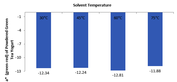 The a* color value represents the chromatic range from -60 = green to +60 = red. Changes in the a* color value of reconstituted powdered green tea yogurt at different solvent temperatures are presented in Figure 4.