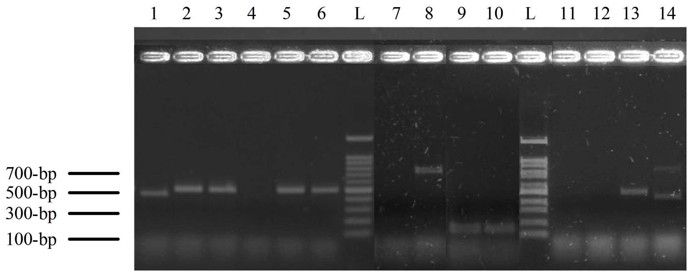 Regarding the RAPD-PCR results, the primer OPI 06 produced 14 fragments. The length of the fragments ranges from 200 to 2000-bp. All of the bands are polymorphic, with a 100% percentage. Data are illustrated in Figure 5.