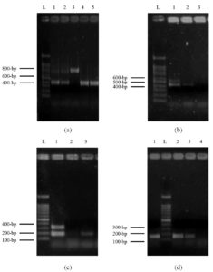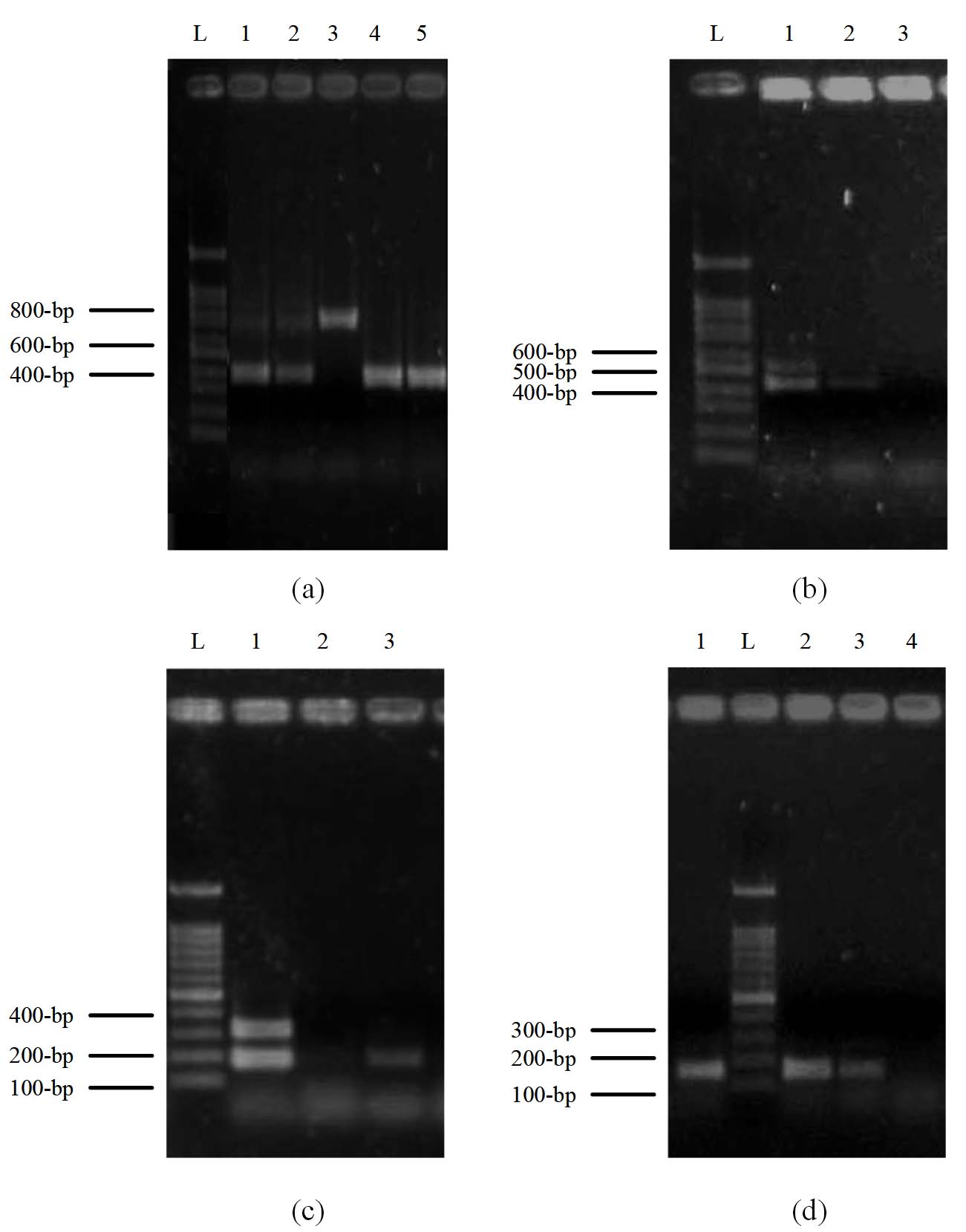 Figure 2. Multiplex PCR profile of Candida genotypes, Mating types, Biofilm formation genes and Phospholipases genes. Lane L: 100-bp ladder. (a) represent the Candida genotyping. Lanes 1 and 2 represent genotype C (two bands of 450 and 840-bp), lane 3 represents genotype B (840-bp), and lanes 4 and 5 represent genotype A (450-bp) of C. albicans isolates. (b) Mating typing. Lane 1 represents heterozygous MTL of two bands of MTLα and MTLα (535 and 423-bp), lane 2 represents homozygous MTLα as one band of 423-bp, and lane 3 shows no band for isolates. (c) Biofilm formation. Lane 1 represents two bands of ALS3 and ALS1 genes (185 and 319-bp), lane 2 shows no bands, and lane 3 shows one band of ALS3 (185-bp). (d) Phospholipases genes. Lane L: 100-bp ladder, lanes 1, 2, and 3 represent bands of the PLB1 gene (179-bp), whereas lane 4 shows no bands