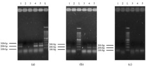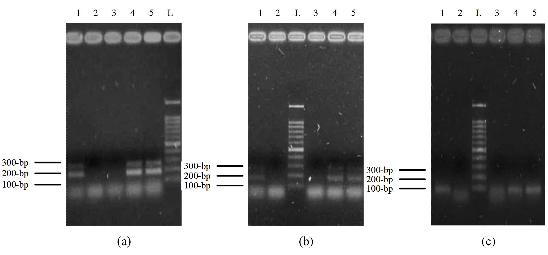 Figure 3. Multiplex PCR profile of Candida species Secreted Aspartic Proteinases genes. Lane L: 100-bp ladder. (a) Lane 1 represents SAP2 and SAP8 (bands of 178 and 256-bp), lanes 4 and 5 represent the bands of SAP6 and SAP5 (187 and 277-bp). However, lanes 2 and 3 don’t show any bands. (b) Lane 1 represents SAP7 and SAP3 (196 and 231-bp), lanes 4 and 5 represent SAP4 and SAP3 (171 and 231-bp), and lanes 2 and 3 do not show any bands. (c) Lanes 1,4, and 5 represent bands of SAP9 or SAP10 (90-bp), whereas lanes 2 and 3 show no bands