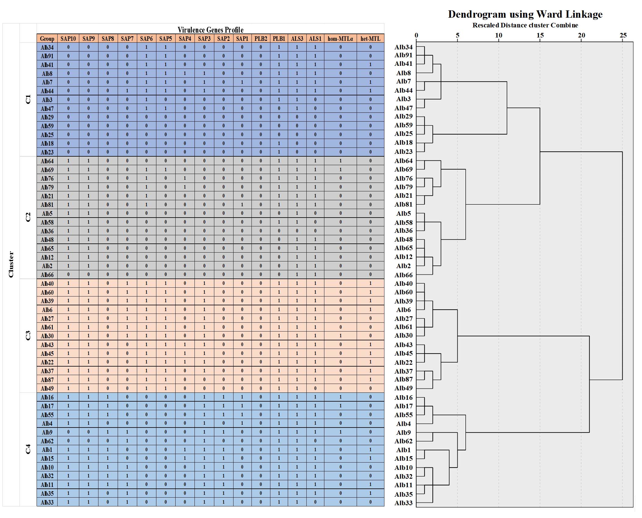 The dendrogram obtained by Ward’s linkage for the 53 C. albicans isolates recovered from Palestine concerning the virulence genes (including MTLa1, MTLα1, ALS1, ALS3, PLB1, PLB2, and SAPs), which were clustered into four groups: C1, C2, C3, and C4 at a cut-off similarity of 50%. However, isolates in clusters C1, C2, C3, and C4 were grouped at a cut-off similarity of about 90%. Cluster C1, C2, and C4 could be subdivided into four sub-clusters (Figure 4).