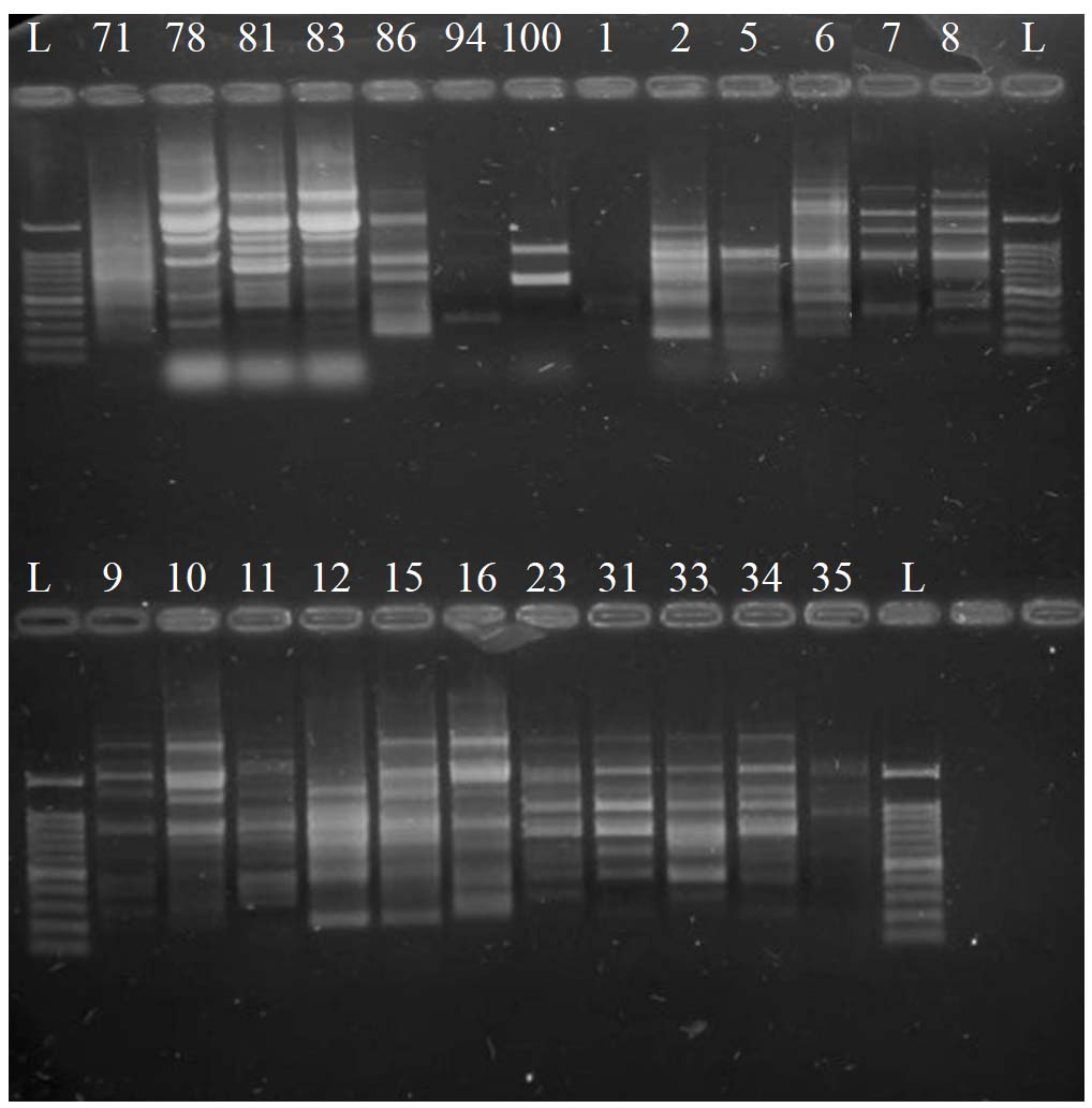 Figure 5. RAPD-PCR product profiles using the primer OPI_06. Lane L = ladder 100-bp. The 24 labeled Lanes are for the RAPD-PCR product of C. albicans DNA of the recovered isolates in Palestine