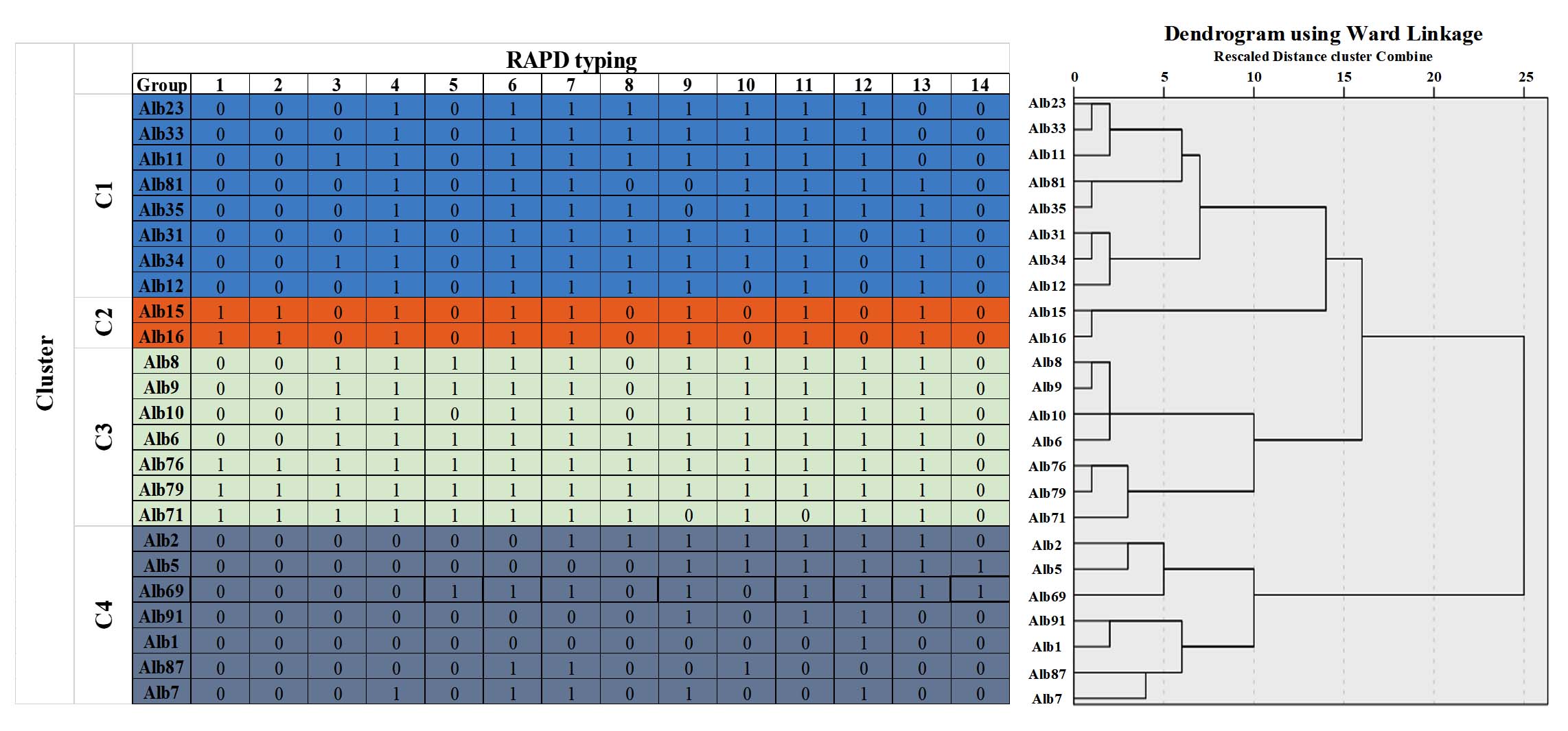 The dendrogram obtained by Ward’s linkage for the RAPD-PCR product of 24 C. albicans isolates recovered from Palestine were clustered into four groups (C1, C2, C3, and C4), depending on a 50% cut-off similarity. Therefore, isolates in cluster C1 were grouped at a cut-off similarity of 80%, whereas in C3 and C4 clusters, isolates were grouped at a cut-off similarity of 90%. Cluster C3 and C4 could be subdivided into three and five sub-clusters, respectively. Data are shown in Figure 6.
