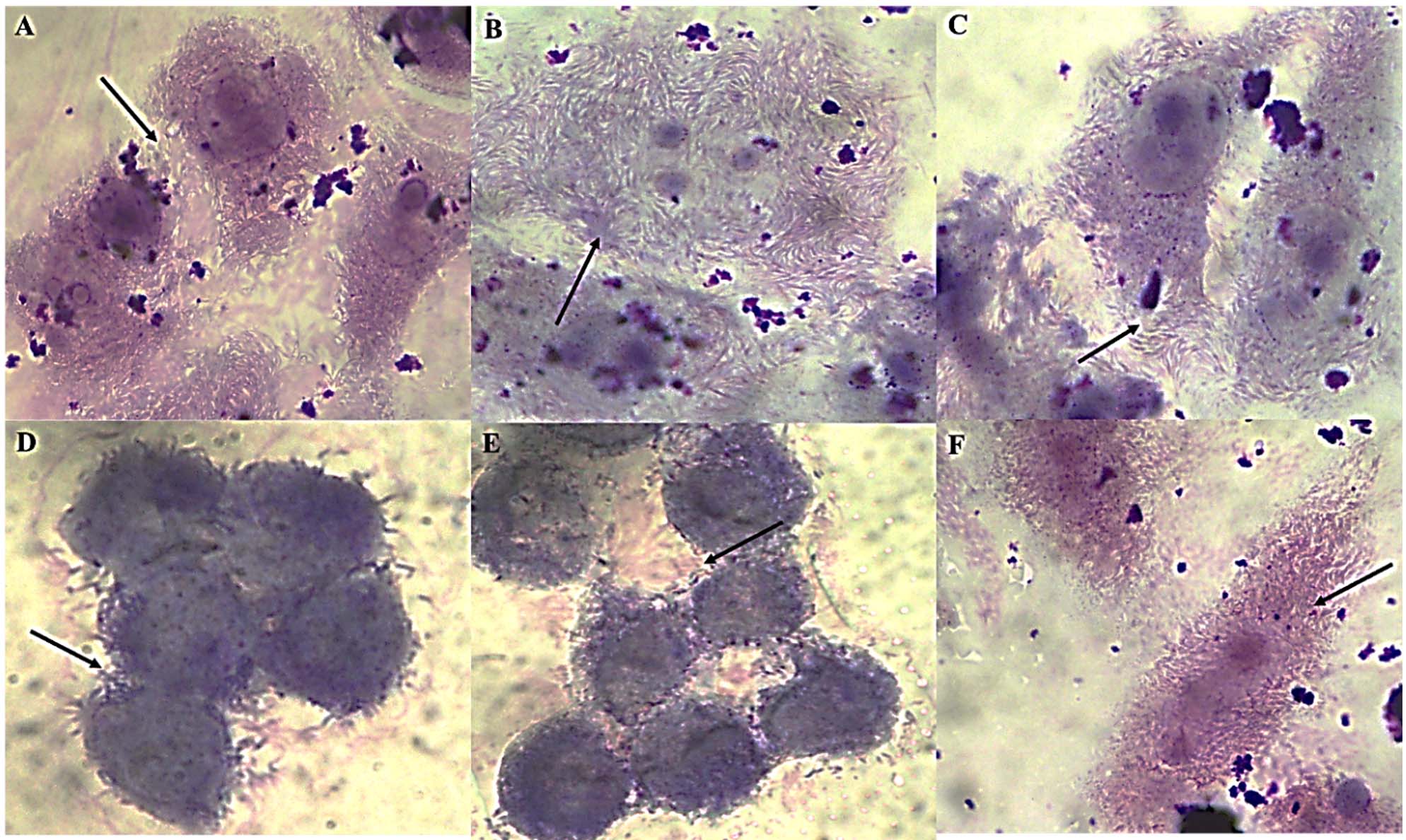 Figure 1. HEp-2 cell adherence patterns of EAEC isolates. Panels (A-C) strong aggregative adherence in MDR isolates R1-R3, (D-F) moderate adherence in non-MDR isolates S1-S3. The characteristic “stacked-brick” pattern indicates typical EAEC morphology