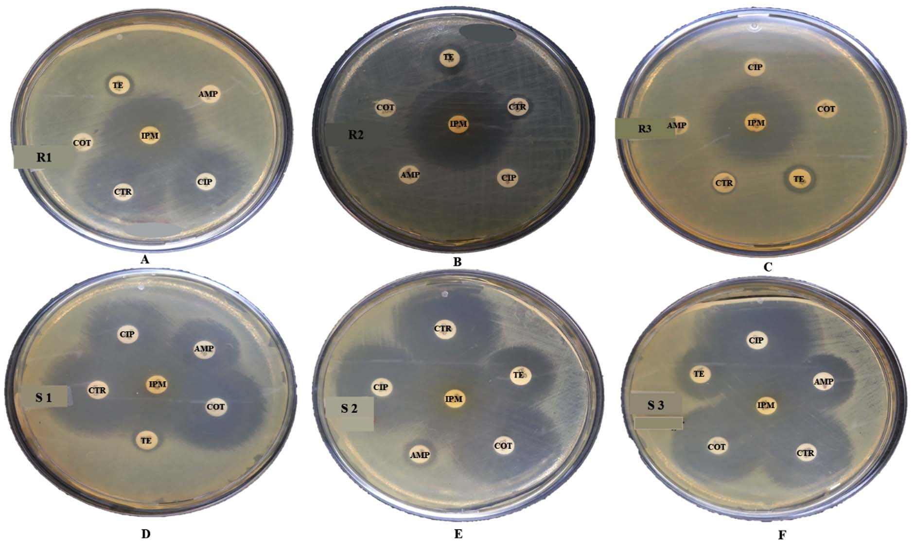 Figure 2. Antibiotic susceptibility patterns of EAEC isolates. Panels (A-C) represent MDR isolates R1-R3, and panels (D-F) show non-MDR isolates S1-S3. Antibiotics tested include imipenem (IPM, 10 mg), co-trimoxazole (COT, 25 mg), tetracycline (TE, 30 mg), ampicillin (AMP, 10 mg), ciprofloxacin (CIP, 5 mg), and ceftriaxone (CTR, 30 mg). Resistance and susceptibility were interpreted according to standard CLSI guidelines