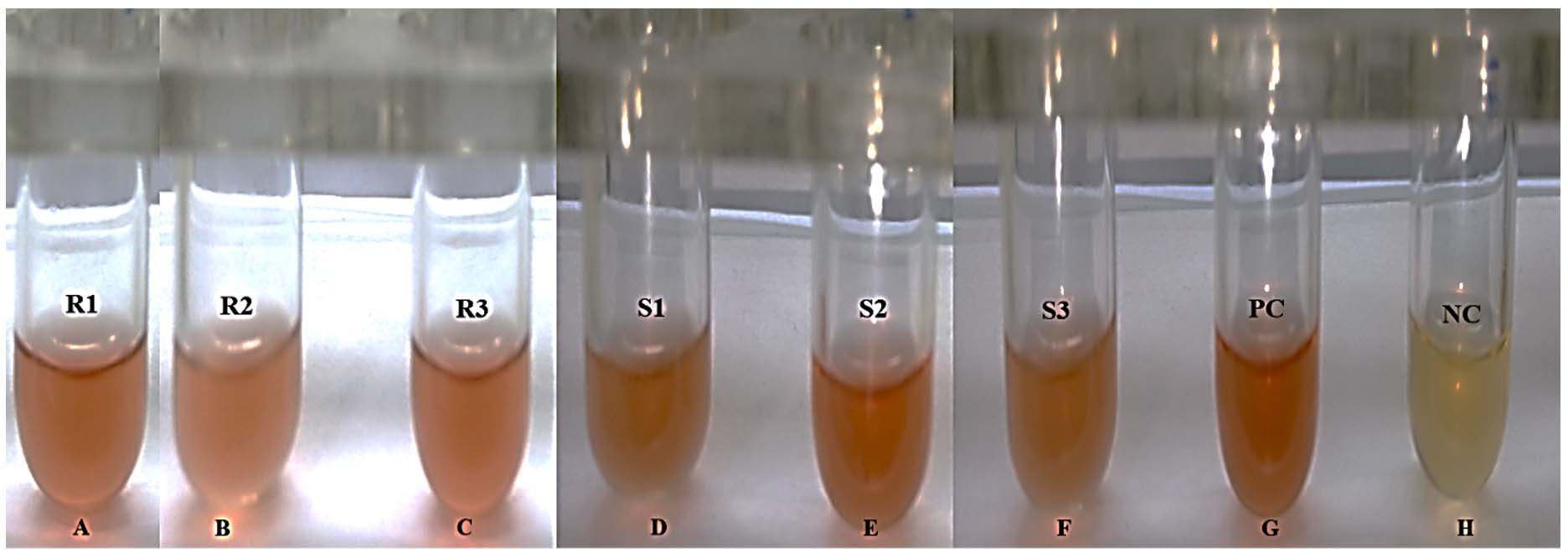 Figure 3. Detection of β-lactamase activity using the Nitrocefin assay. (A) Multidrug-resistant; R1, (B) Multidrug-resistant; R2, (C) Multidrug-resistant; R3, (D) Sensitive; S1, (E)Sensitive; S2, (F) Sensitive; S3, (G) Positive control, (H) Negative Control. This chromogenic test indicates the presence of β-lactamase enzymes in EAEC isolates. A color change from yellow to red signifies a positive reaction, confirming β-lactamase production, which is associated with resistance to β-lactam antibiotics. Yellow indicates a negative result (no enzyme activity), while red indicates a positive result (active β-lactamase production)