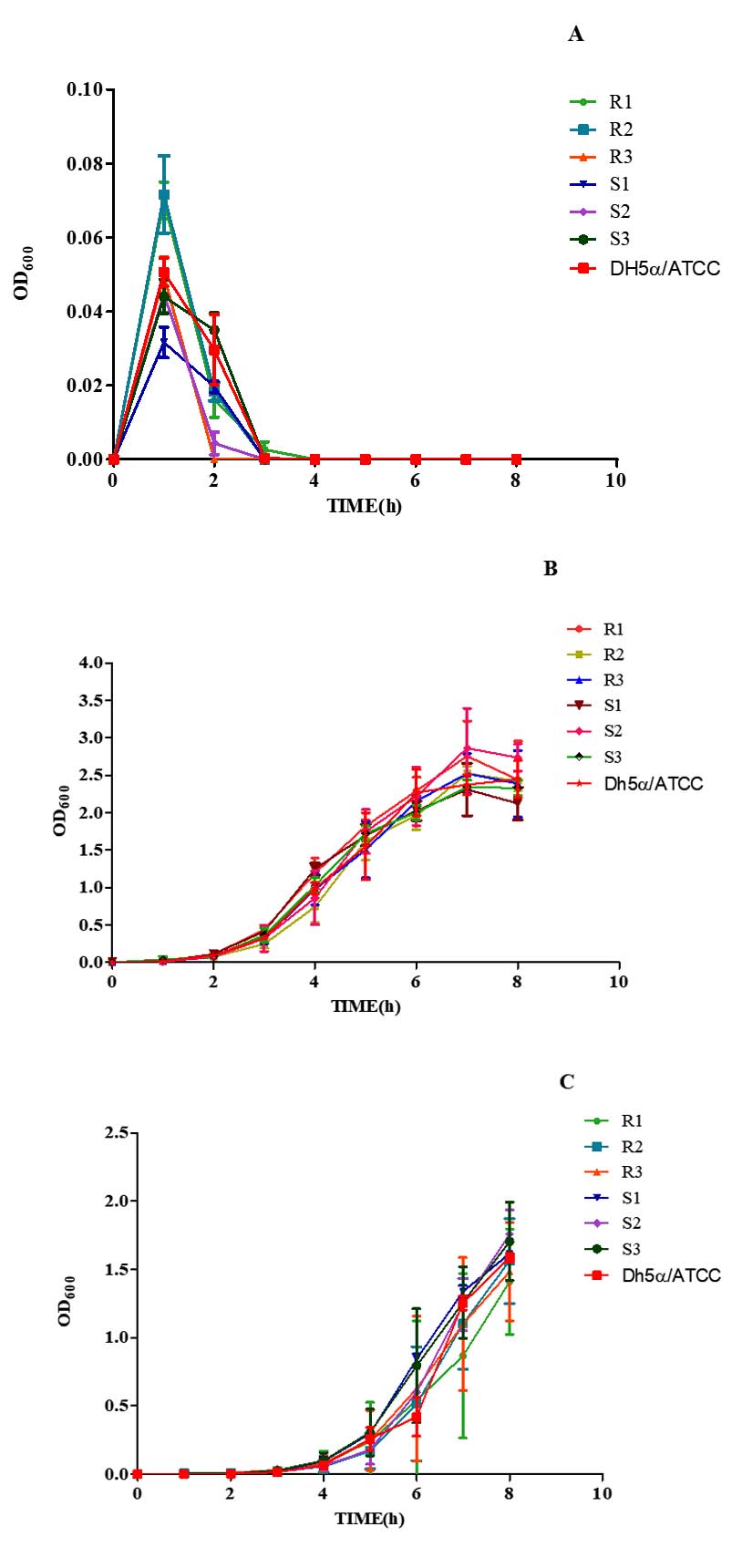 Figure 4. Growth kinetics of MDR (R1-3) and non-MDR (S1-3) EAEC isolates at pH (A) 3.0, (B) 7.4, (C) 9.0. Comparing growth kinetics of MDR and non-MDR EAEC isolates at pH 3.0, R1 and R2 show similar declining slopes (-0.00715 to -0.00101 and -0.00738 to -0.00101) with r² values of 0.231 and 0.227, respectively. R3 displays a less steep decline (-0.00476 to -0.000202, r² = 0.167). Non-MDR isolates (S1, S2, S3) exhibit less negative slopes and higher r² values. At pH 7.4 and 9.0, all MDR and non-MDR isolates show positive slopes (0.103 to 0.482) with r² values ranging from 0.580 to 0.931. This suggests differing responses to acidic pH between MDR and non-MDR isolates, but similar trends at neutral and alkaline pH levels as determined by linear regression assay