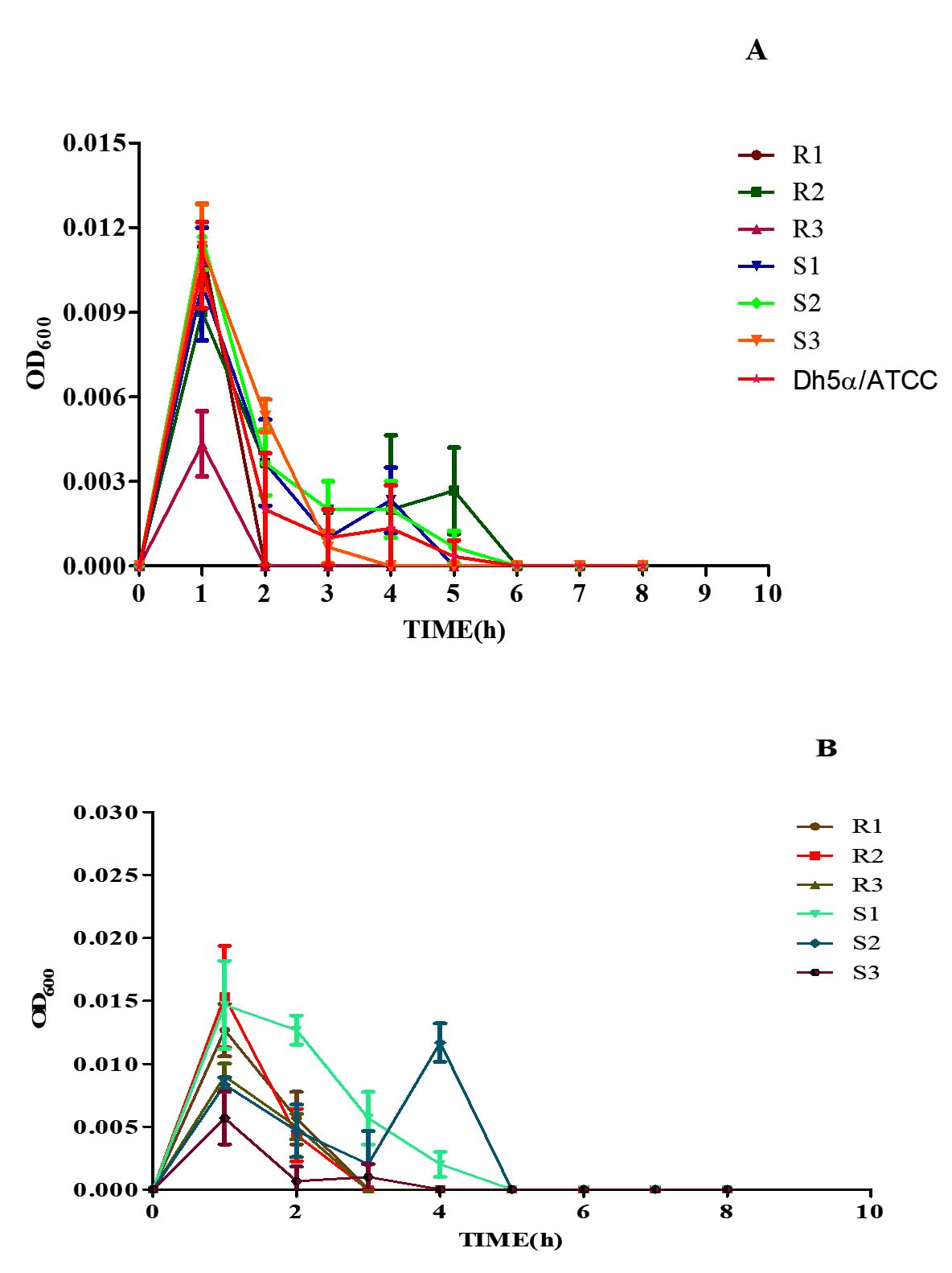 To study the effects of in vitro gut conditions under stress on the growth of MDR and non-MDR strains, cultures were grown separately in sterile nutrient broth supplemented with bile salts (0.80%), hydrogen peroxide (H2O2); (1%, 2.5%) and varying pH levels (3.0, 7.4, 9.0), and control cultures were maintained under standard conditions without any stressors. Each culture flask was incubated at 37 °C in a shaker incubator set at 200 rpm (Eppendorf, USA). The optical density (OD) at 600 nm was measured hourly for up to 8 hours.