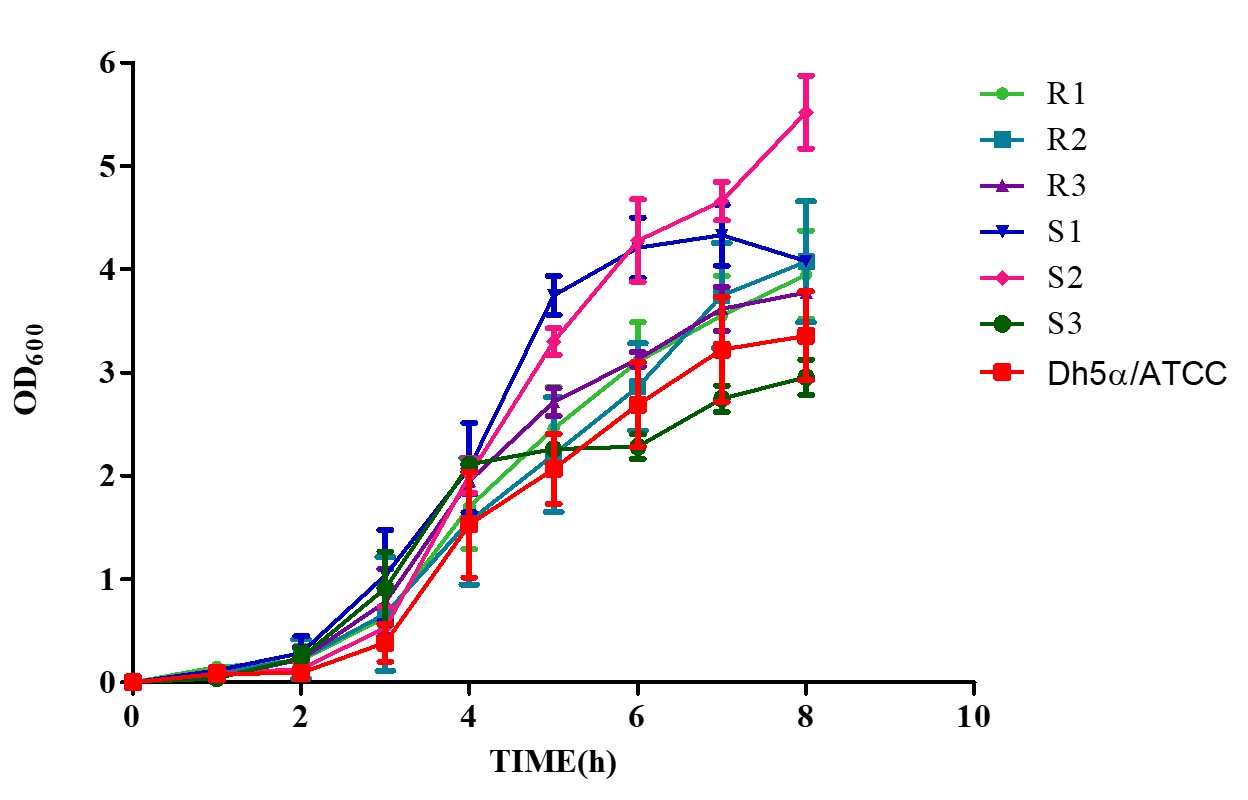(p < 0.001). Non-MDR (S1 and S2) showed a steadily increasing growth rate compared to MDR (R1-3) isolates (Figure 6), but only non-MDR, S3 strain showed an enhanced growth pattern until 4 hours of incubation and remained stable. The slopes of the growth curves ranged from 0.4984 to 0.6262, indicating a steady increase in growth over time. The coefficient of determination (r²) values ranged from 0.8939 to 0.9478, suggesting strong correlations between the observed and predicted values, indicating a good fit of the linear regression models.