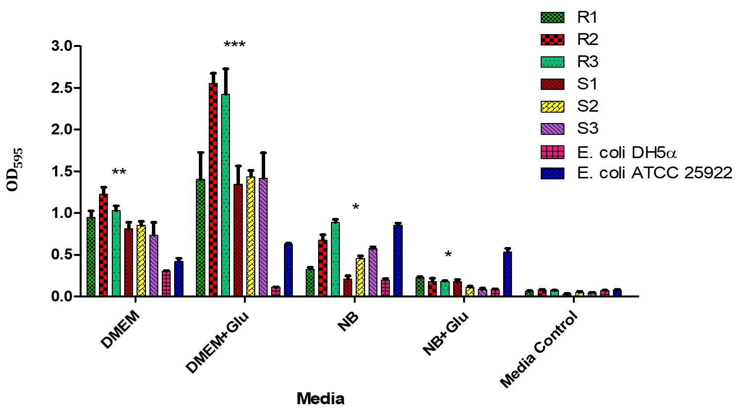 Figure 7. Biofilm formation by MDR and non-MDR EAEC isolates in different media. The graph shows biofilm formation in Dulbecco’s Modified Eagle Medium (DMEM), DMEM supplemented with D-glucose, Nutrient Broth (NB), NB supplemented with D-glucose, and media control. Each bar represents the mean optical density (OD) at 595 nm, with error bars indicating standard deviations