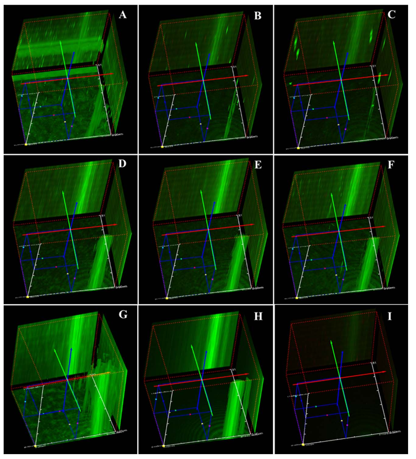 Figure 9A. Biofilm formation of MDR and non-MDR EAEC isolates at 48 hours in glucose-supplemented medium visualized by confocal microscopy. Live bacteria appear green, while dead bacteria are shown in red. (A-C) MDR strains (R1-R3), and (D-F) non-MDR strains (S1-S3), (G and H) control strains (E. coli ATCC 25922 and DH5α), (I) the negative control