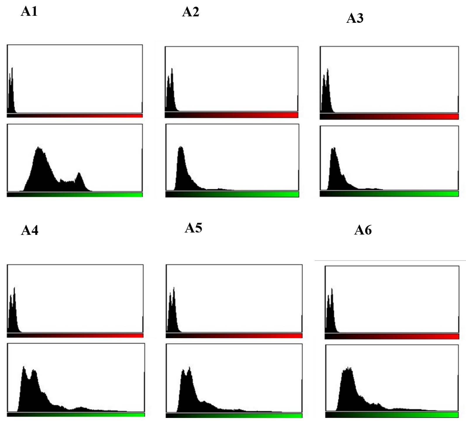 Figure 9B. Quantitative assessment of biofilm formation by MDR and non-MDR EAEC isolates in the presence of glucose at 24 hours using confocal microscopy. Green intensity bars represent live bacteria, while red intensity bars indicate dead bacteria. (A1-A3) correspond to MDR isolates (R1-R3), and (A4-A6) correspond to non-MDR isolates (S1-S3)
