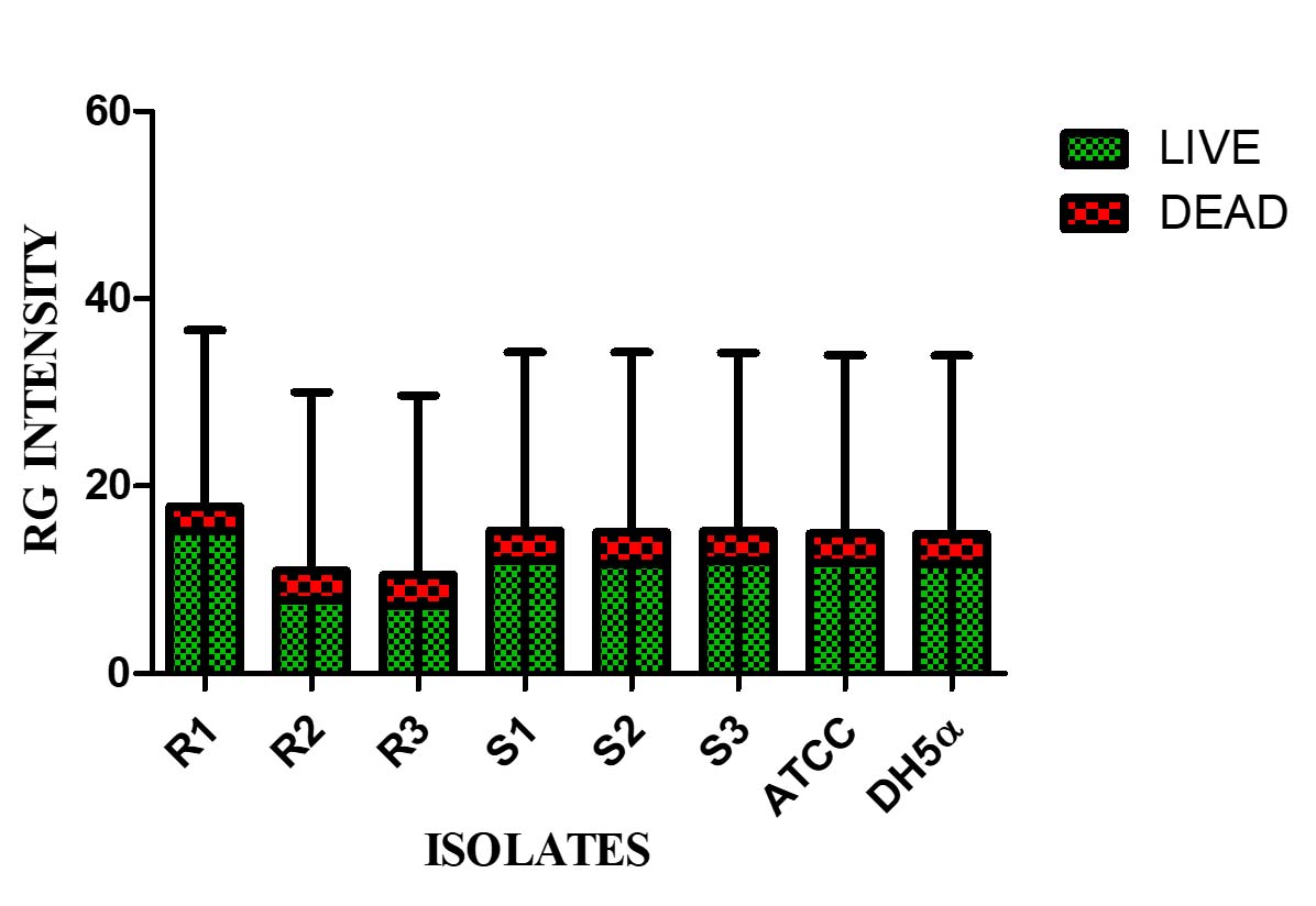 Figure 9C. Red-Green intensity plot of biofilm formation by MDR and non-MDR EAEC isolates in the presence of glucose at 24 hours, visualized via confocal microscopy. Green intensity bars indicate live bacteria, while red intensity bars represent dead bacteria. The plot reflects comparative viability within biofilms formed by MDR and non-MDR strains