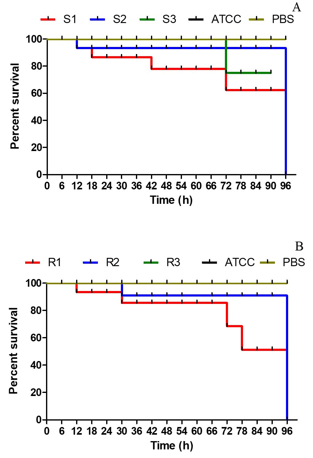 Figure 10. Kaplan–Meier survival curves for Galleria mellonella larvae infected with EAEC strains. (A) Larvae infected with non-MDR EAEC strains; (B) Larvae infected with MDR EAEC strains at a dose of 1×107 CFU mL-1. Control groups included larvae injected with PBS and E. coli ATCC 25922. Survival was monitored over time, and differences between groups were statistically evaluated using the log-rank test to assess the impact of multidrug-resistance on virulence