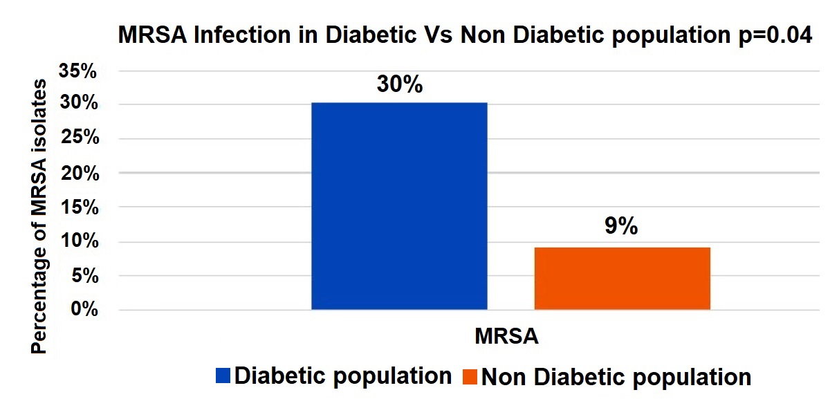 A significantly higher proportion of MRSA infections was observed in the diabetic population (30%) compared to the non-diabetic population (9%), with statistical significance (p = 0.04). This suggests that diabetes is a potential risk factor for MRSA infections (Figure 2).