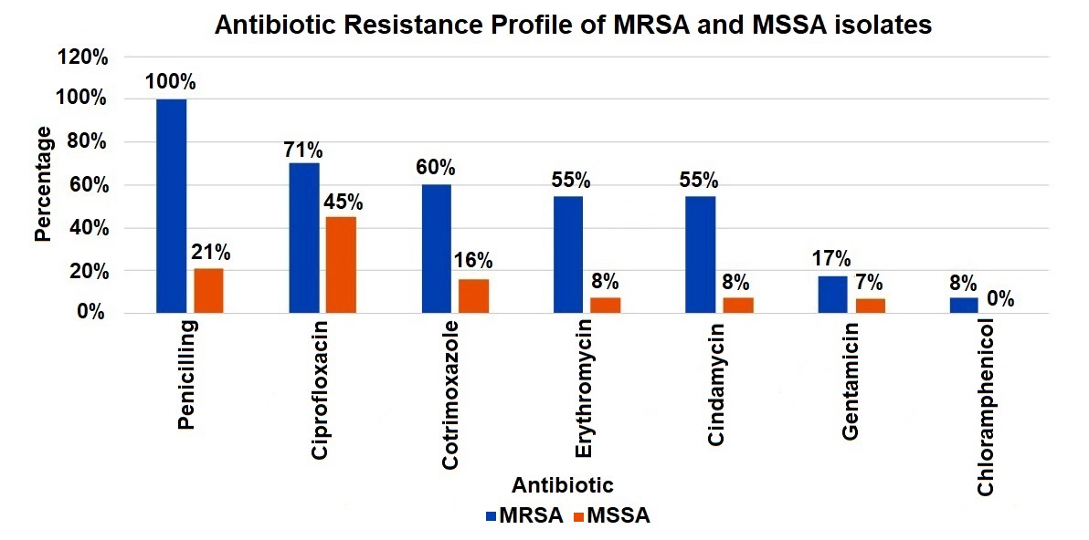 MRSA isolates demonstrated the highest resistance to penicillin (100%), followed by ciprofloxacin (71%), cotrimoxazole (60%), erythromycin (55%), and clindamycin (55%). Lower resistance rates were observed for gentamicin (17%) and chloramphenicol (8%). In comparison, MSSA isolates exhibited significantly lower resistance across all tested antibiotics, indicating a distinct difference in resistance patterns between MRSA and MSSA strains.