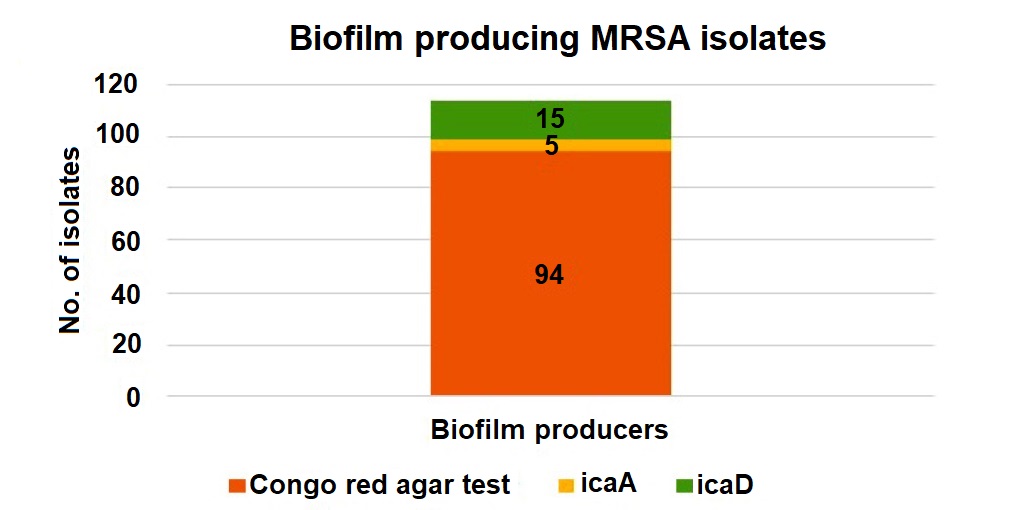 Out of the total MRSA isolates, 94 were identified as biofilm producers by the Congo Red agar (CRA) test. Among these, only 5 and 15 isolates showed the presence of the icaA and icaD genes, respectively, indicating a limited genotypic correlation with phenotypic biofilm production.