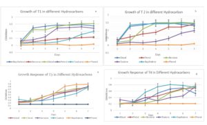 The four isolates, named T1, T2, T3, and T4, were found to grow on all salt concentrations except 20%. These isolates exhibiting different colony morphologies were selected and further screened for hydrocarbon-utilizing ability under salt stress by inoculating them on plates enriched with 1% of petrol and diesel and 5% salt concentration. It was seen that all 4 isolates showed considerable growth in the presence of 5% salt + 1% petrol, as well as 5% salt + 1% diesel, indicating that these isolates were capable of metabolizing hydrocarbons in a saline environment (Table 4). Therefore, these 4 isolates were selected for further characterization.
