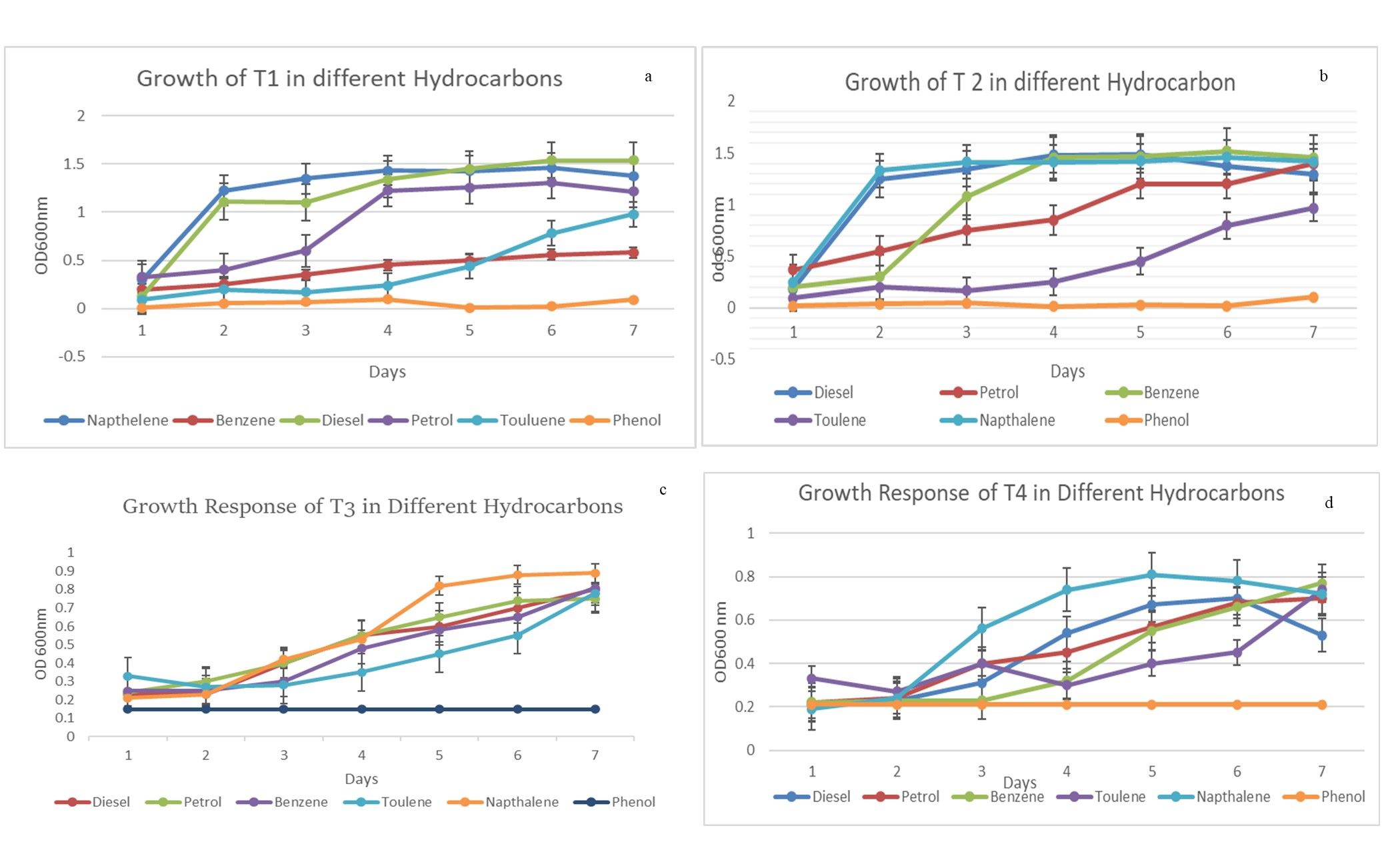 100 µl of selected microbes from 2.4.2 and 2.4.4 were added to BHM agar plates that were supplemented with 1% of various hydrocarbons (diesel, benzene, toluene, naphthalene, and phenol) as carbon sources. Plates were placed at 37 °C for 48 hours and subsequently monitored for growth. Growth curve response of these isolates for utilizing these hydrocarbons was also monitored for seven days. Fresh overnight culture of the selected isolates was added to labelled flasks containing BHM supplemented with 1% of petrol, diesel, benzene, toluene, naphthalene, and phenol each as carbon sources. Flasks were kept at 37 °C at 160 rpm. The aliquots were taken, and OD was recorded spectrophotometrically (Shimadzu).