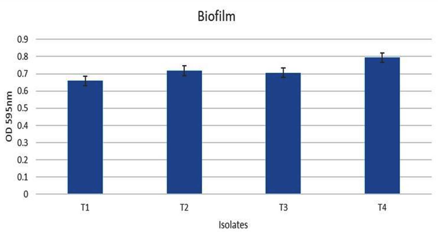 The glass tube assay24 was used to assess biofilm formation. The overnight bacterial cultures in LB broth (1 ml) were added to glass tubes and incubated at 37 °C for 48 hrs. After the incubation medium was removed, the tubes were gently washed with PBS to eliminate non-adherent cells. Biofilms were identified by staining with 0.2% crystal violet and later destained with 95% ethanol. The presence of a crystal violet ring representing cell mass was considered positive for biofilm formation. Biofilm growth was quantified by microtiter plate assay. Briefly, 200 µl of bacterial culture was inoculated in triplicate into a 96-well plate in triplicate and incubated at 37 °C for 48 hours. After incubation, the culture was discarded, and the wells were washed twice with PBS, air dried, and stained with 200 µl of 0.2% crystal violet for 5 min. The excess stain was removed by washing with distilled water, and then the plate was air-dried. 200 µl of 95% ethanol was added to solubilize the bound dye for 30 min, and absorbance was measured at 595 nm using an ELISA plate reader (Shimadzu). The extent of Biofilm formation was quantified in terms of the absorbance of ethanol solution containing solubilized crystal violet.