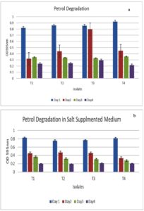 The growth patterns of each of the 4 isolates on BHM supplemented with different concentrations of petrol are represented in Table 2. All 4 isolates showed growth on all concentrations of petrol. Therefore, all these isolates were selected for further characterization. These isolates were named as T1, T2, T3, and T4.