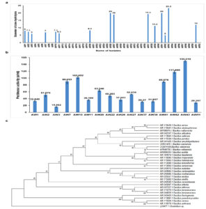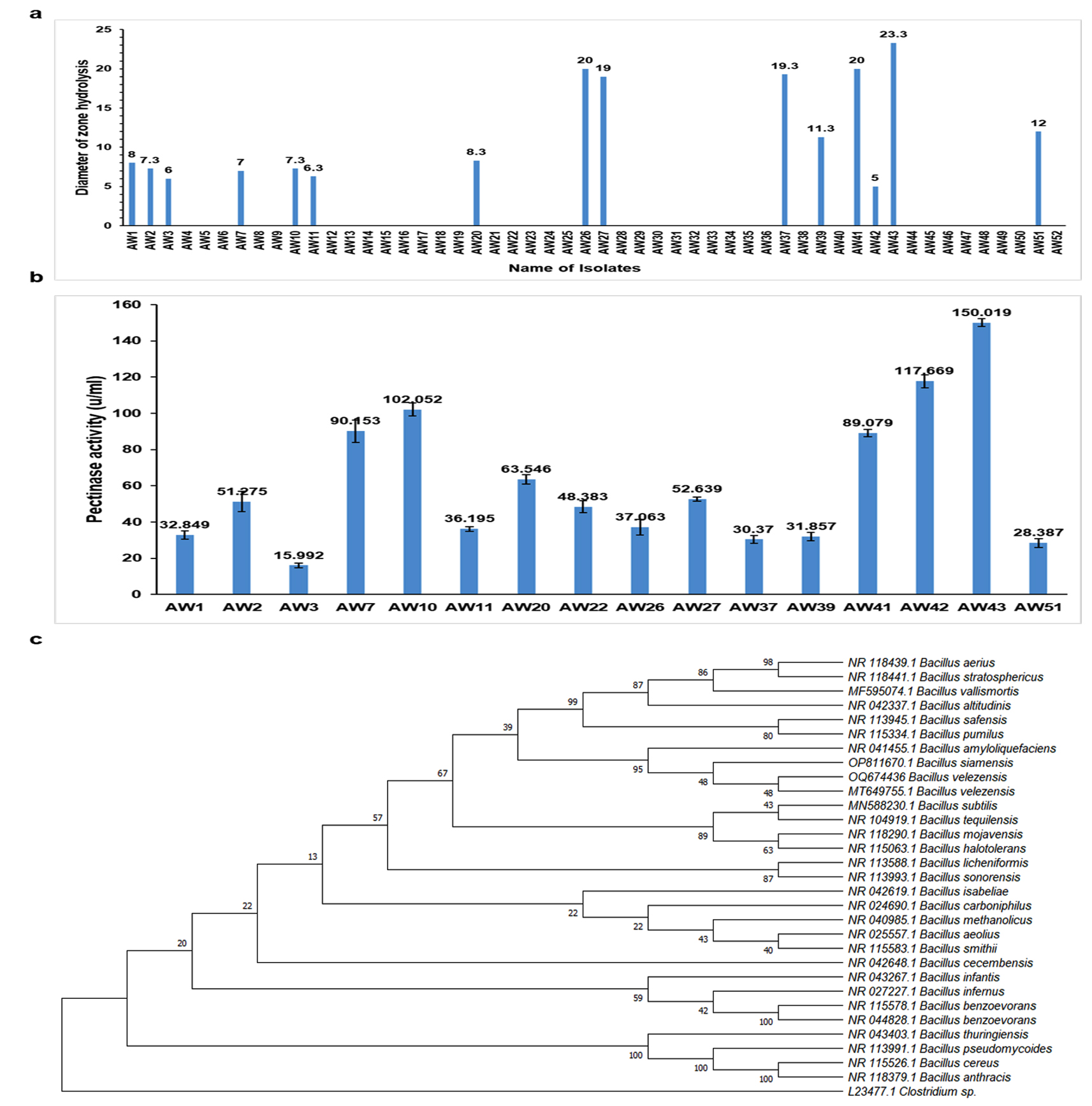 Figure 1. Production of pectinase by A43 and its identification. (a) Graph showing the zone of hydrolysis of different isolates on 1% YEP agar. (b) Graph showing the pectinase activity of the 16 isolates after submerged fermentation in YEP broth. (c) Phylogenetic analysis of Bacillus velezensis (bacterial isolate AW43)