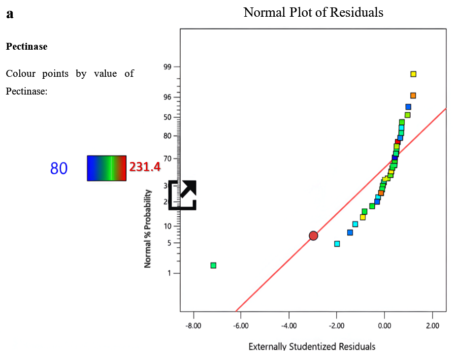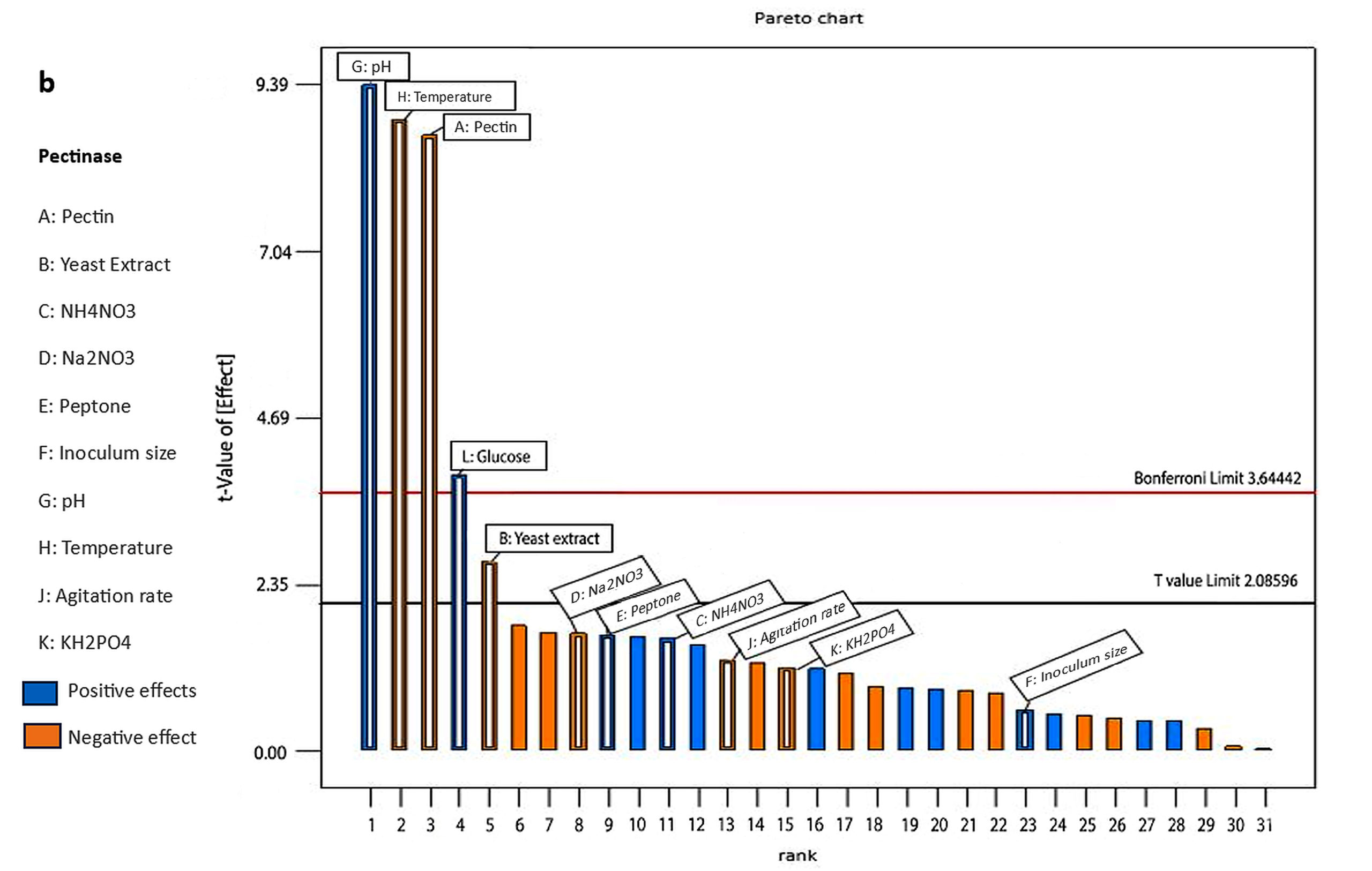 Factors that exerted a positive influence on pectinase production were initially determined using PDB. Eleven variables were analyzed on a two-factorial level (high or low). The ANOVA performed on the response data yielded a model F-value of 25.13, indicating a high level of statistical significance. The R² and adjusted R² values were determined to be 0.9325 and 0.8954, respectively, highlighting the model’s statistical robustness and validity (Table 3). Pectin, Yeast extract, pH, temperature, and glucose were shown to positively modulate pectinase production (Figure 2). Figure 2a shows that the normal probability plot of the residuals indicated that most of the data points were close to the reference line, implying that the factors were approximately normally distributed, with only a few minor deviation at the tails. Figure 2b shows that the Pareto chart shows the standardized effects of each factor on the response variable, arranged from largest to smallest. From the graph its visible that pH, temperature and pectin have the largest effect followed by glucose and yeast extract. Based on the PB design, the formula for the pectinase production is: