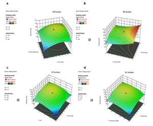 The factors identified by the PBD were further examined using the Box-Behnken design in Design Expert software. The variables and their ranges used in the study are outlined in Table 2. A total of 46 experimental runs were carried out. The validity of the generated model is verified using ANOVA.