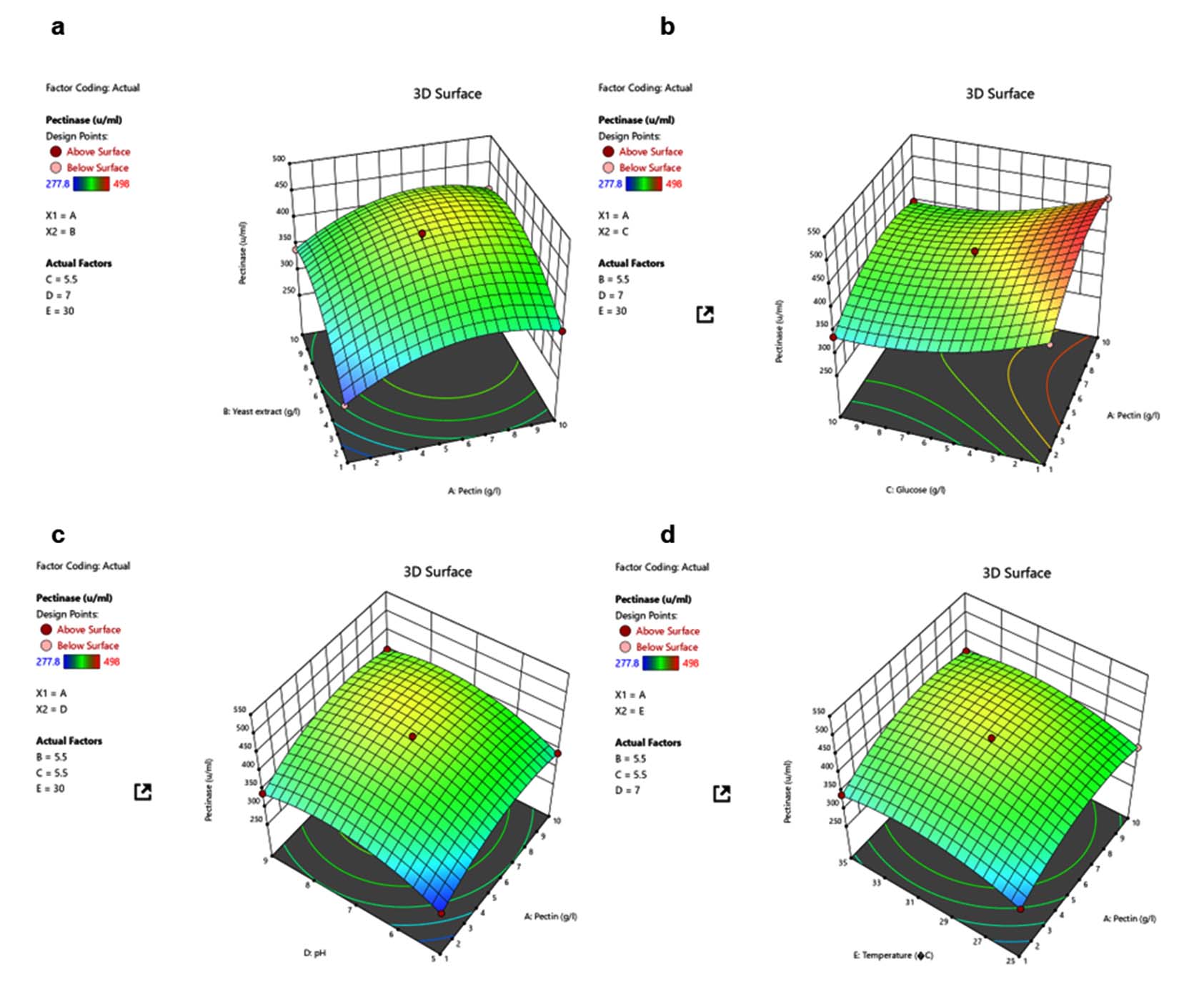 Based on the Box-Behnken design, the highest enzyme activity of 491.337 U was observed when the media contained pectin 5.5 g/L, yeast extract 10 g/L, glucose 1.0 g/L, pH 7.0, and incubated at 30 °C. On the other hand, the lowest activity of 474.747 was determined to be when pectin 9.318 g/L, yeast extract 8.895 g/L, glucose 1.798 g/L, pH 7.608, and incubated at 28.637 °C. The design analysis identified the optimal parameter for pectinase production as pectin 5.5 g/L, yeast extraction 10 g/L, glucose 1.0 g/L, pH 7 with incubation at 30 °C.