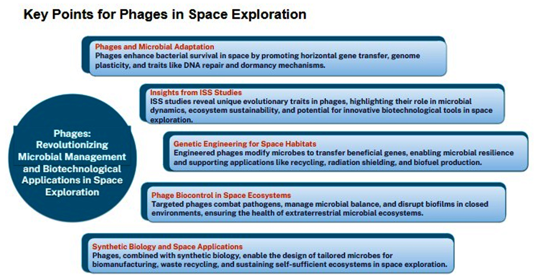 Moreover, phages influence microbial dynamics by shaping bacterial genome plasticity through rapid horizontal gene transfer and integration patterns. These adaptations allow bacteria to maintain functionality and resilience in stressful conditions, including the physicochemical extremes of space. Understanding these mechanisms offers insights into ecosystem sustainability in extraterrestrial environments and informs the development of phage-based biotechnological tools for space missions (Figure 1).7