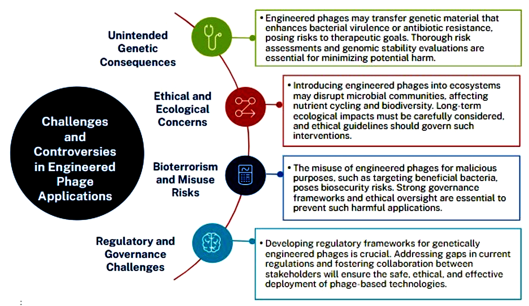 However, genetically engineered phages pose potential risks, particularly unintended genetic consequences. The interaction between engineered phages and bacterial hosts may lead to horizontal gene transfer, unintentionally passing on undesirable genetic traits, such as those associated with virulence or antibiotic resistance. Despite their specificity, phages may also infect non-target bacterial populations, disrupting local microbiomes or ecological dynamics.67 Recent advancements in synthetic biology improve the precision of these modifications, but they could still result in unexpected outcomes, such as altered pathogenicity or host specificity.34 Therefore, rigorous safety protocols, including comprehensive risk assessments, must be implemented during phage development and clinical trials.75