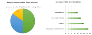 Figure 3. Department-wise Prevalence of MDR Acinetobacter spp.: (ICU: 50%, Medical Ward: 35%, Surgical Ward: 15%) & Distribution of risk factors: Prolonged Catheterization (75%), ICU stay (60%), Poor Hand Hygiene (50%), and Comorbidities (40%)