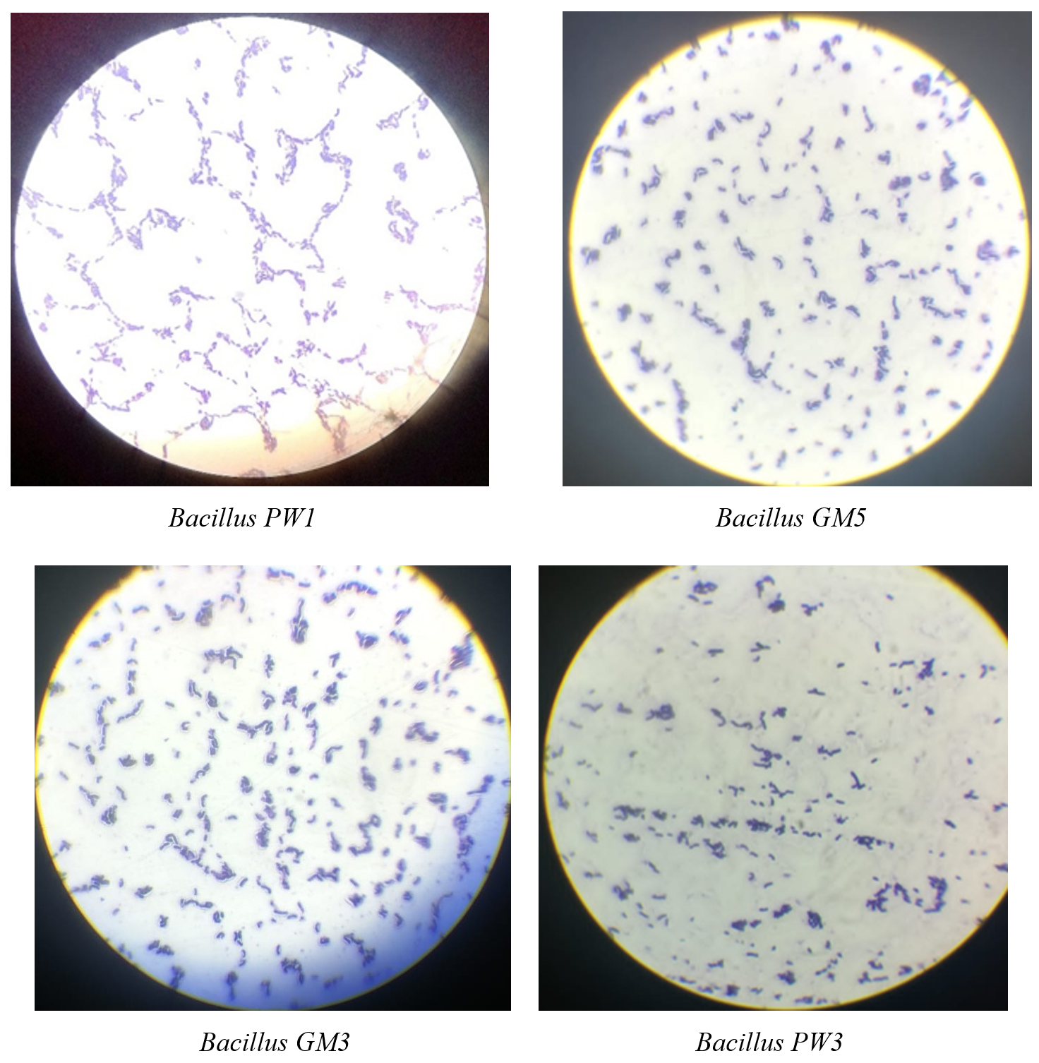 Results revealed four Bacillus spp. isolated from soil which were creamy in colour and mucoid. Characterization was done using microscopy and biochemical tests (Table 1). All the Bacillus isolates were rod-shaped Gram-positive bacteria (Figure 1). These bacterial isolates were identified and named as Bacillus PW1, Bacillus GM3, Bacillus GM5, and Bacillus PW3.