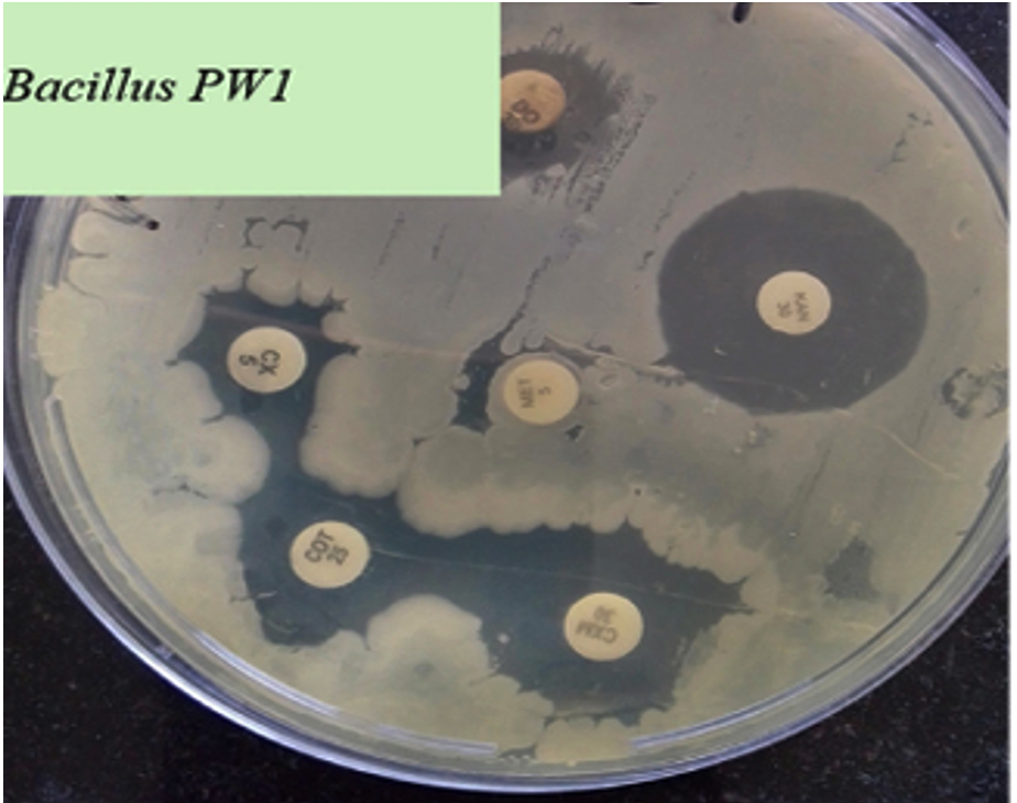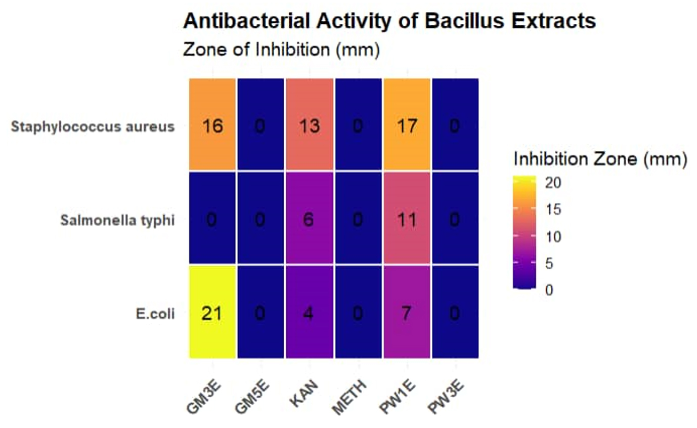 Bacillus PW1 showed broadest antimicrobial spectrum against all 3 pathogens. Bacillus GM3 was able to inhibit growth of two pathogens namely E. coli and Staphylococcus aureus; however, Salmonella Typhi was resistant to the cell free extract produced by Bacillus GM3.