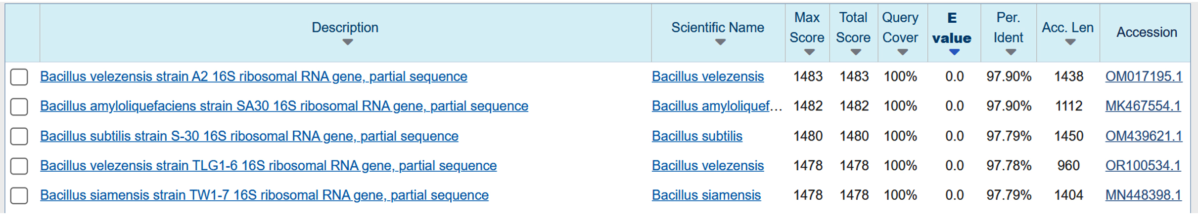 After PCR amplification and sequencing of Bacillus PW1, a consensus sequence of 858 base pairs was obtained which was aligned in the nucleotide sequence database of NCBI using BLAST search tool to estimate the sequence homology and identification of bacterial isolate by comparing consensus sequence with sequences of NCBI database. The comparison of the generated sequence with sequences of the GenBank database indicated that Bacillus PW1 belonged to the genera Bacillus (Figure 4). The sequence has been submitted to the GenBank database and obtained an accession number PX457090.