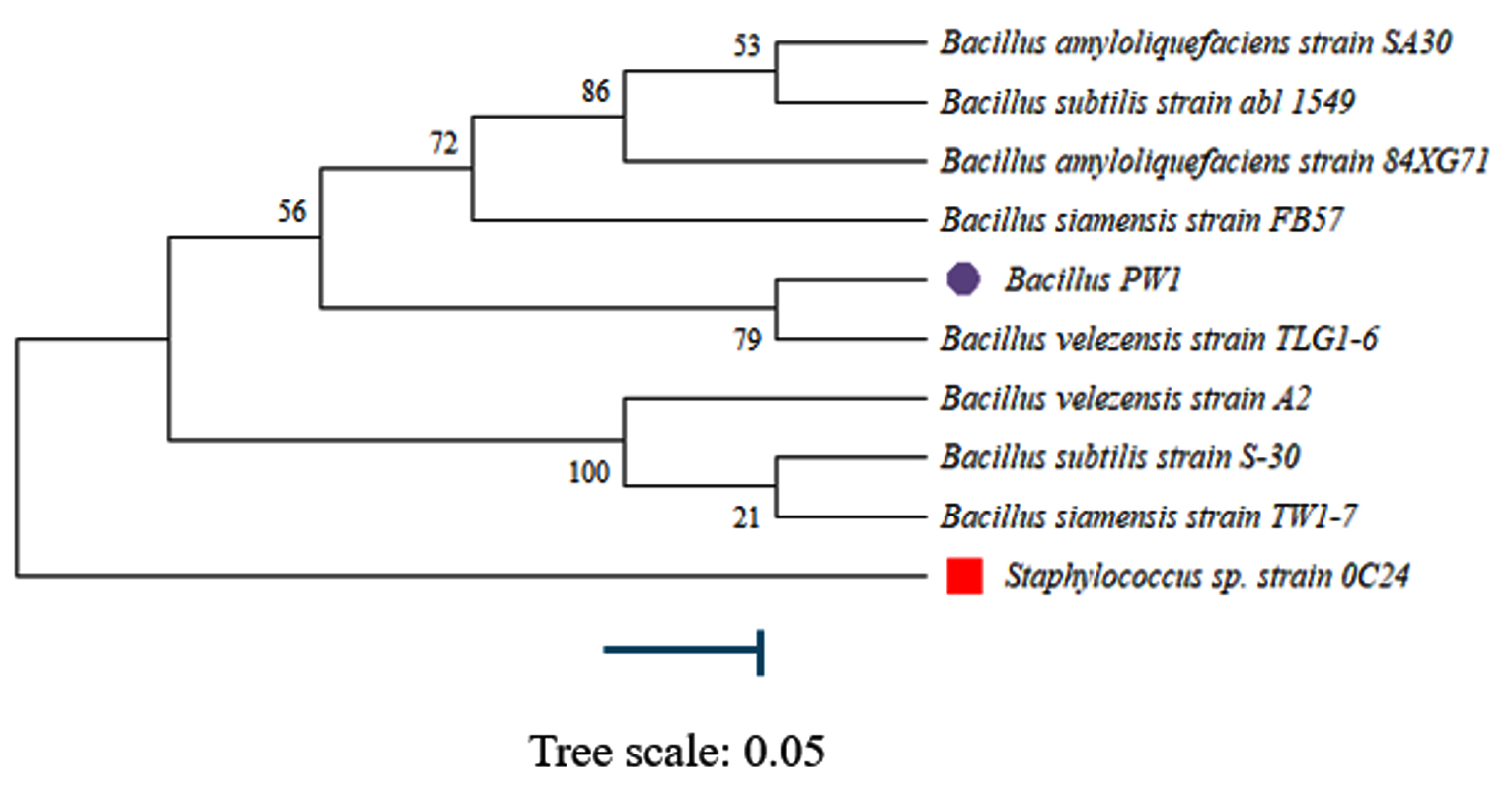 According to the phylogenetic tree, Bacillus PW1 is closely related to Bacillus velezensis strain TLG1-6. Neighbor-joining method was used to build a phylogenetic tree using the Mega 11 software.20 Boot-strap analysis, derived from 1000 sampling, was used to determine confidence values of individual branches in the phylogenetic tree (Figure 5). The evolutionary history of the analyzed data is represented by the bootstrap consensus tree, which was generated from 1000 replicates. The Maximum Composite Likelihood method was used to determine sequence distances.20 This analysis involved 10 nucleotide sequences. The amount of change estimated to have occurred between a pair of nodes was represented by branches. Staphylococcus sp. strain was the outgroup.