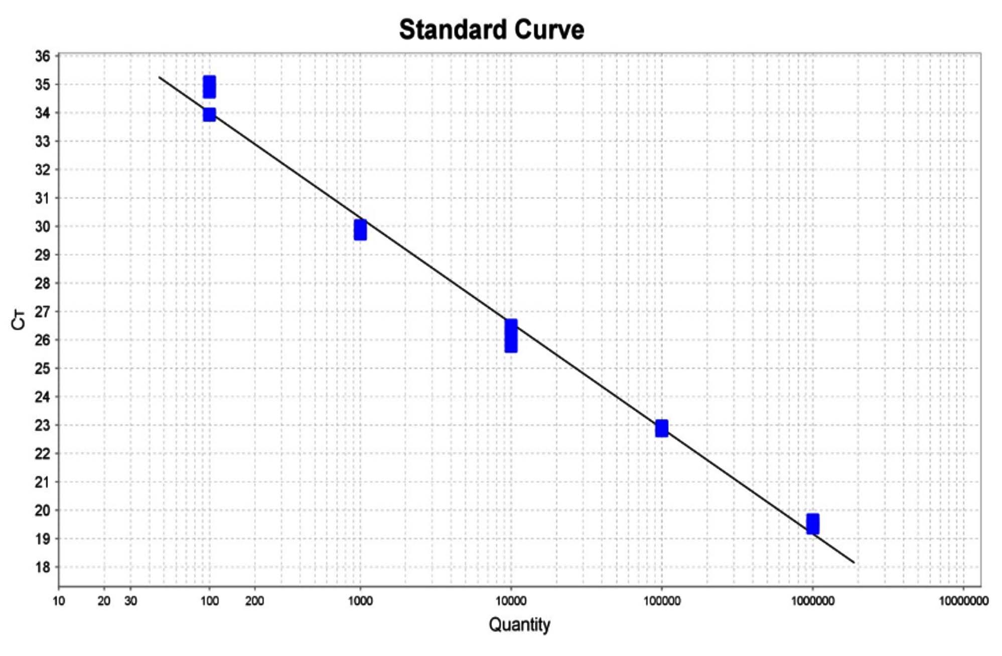 Figure. Standard curve to correlate the DNA concentration of B. melitensis in copies/µL with the cycle threshold (Ct)