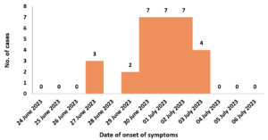 The outbreak curve indicated that the first three cases were reported on 27th June 2023 and additional cases were reported on subsequent days. Peak cases were identified on 30th June, 1st and 2nd July 2023 with seven cases being reported on all three days (Figure 1). The outbreak curve indicated typical picture of a common source of infection.