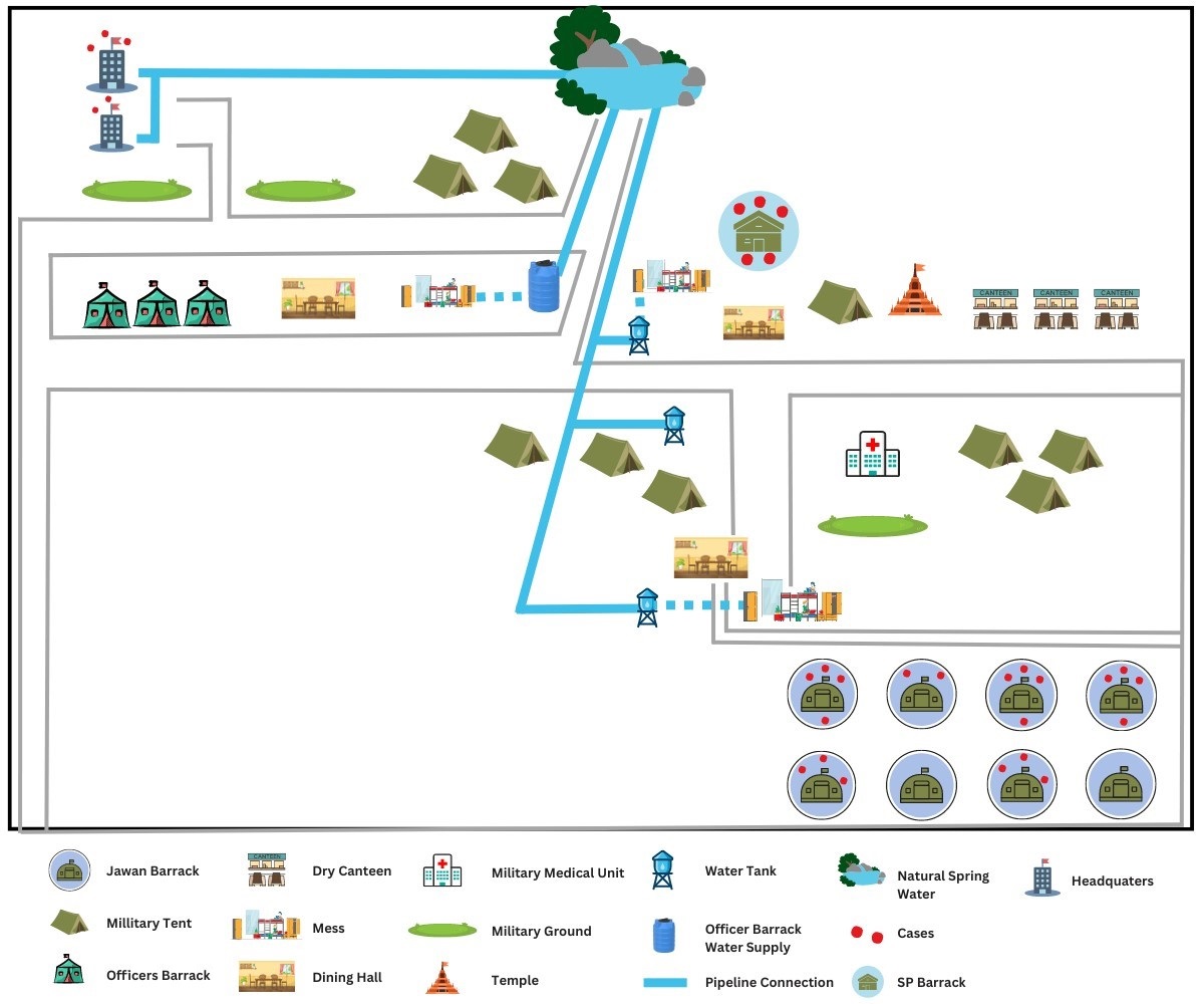During the survey, mess, storage rooms, dining hall and various water sources were inspected thoroughly for cleanliness and sanitation. The food handlers were examined to identify any apparent illness. The place of convenience and refuse disposal site were also inspected. The camp had 3 mess; 1 for officers, 1 for junior officers (subedars) and 1 for soldiers (jawans). The investigation team collected water samples from various sources within the camp compound (1: Officer barrack water supply with reverse osmosis (RO) filter; 3 medium size water tanks with taps) as well as from the open spring water source, which was identified as main source of water supply to the entire military establishment. It was at least 500 meters away from the camp in an uphill road.