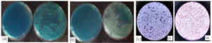 Figure 1. Screening of dye degrading bacteria on dye supplemented plates. a) Growth of S4 and S5 on MB, b) Growth of S4 and S5 on MG, c) Gram-positive (S5) and Gram-negative (S4)