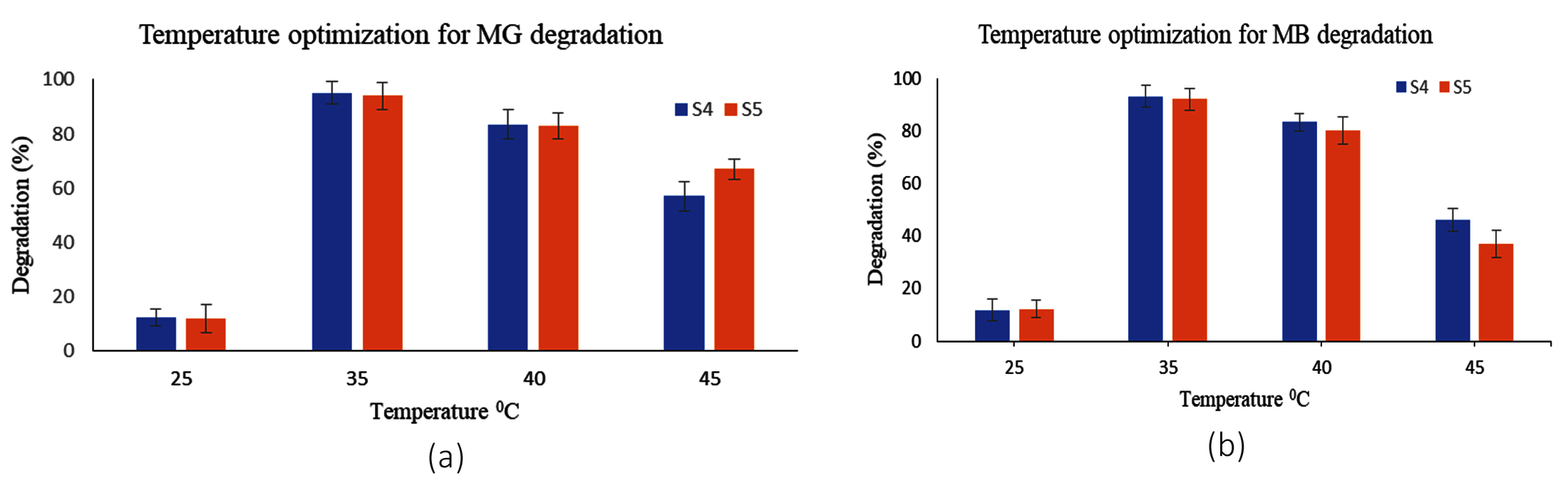 Temperature critically influences dye degradation, as it affects the microbial enzymes. To optimize the temperature influence on dye degradation studies, range of temperature (24, 37, 42 and 45 °C) was setup for working of S4 and S5 bacteria. For MG dye, S4 showed peak degradation at 37 °C (97%), while S5 demonstrated 94% at the same temperature. These results confirm 37 °C as the optimal temperature for dye degradation for both S4 and S5 (Figure 2a, b).