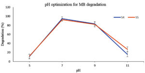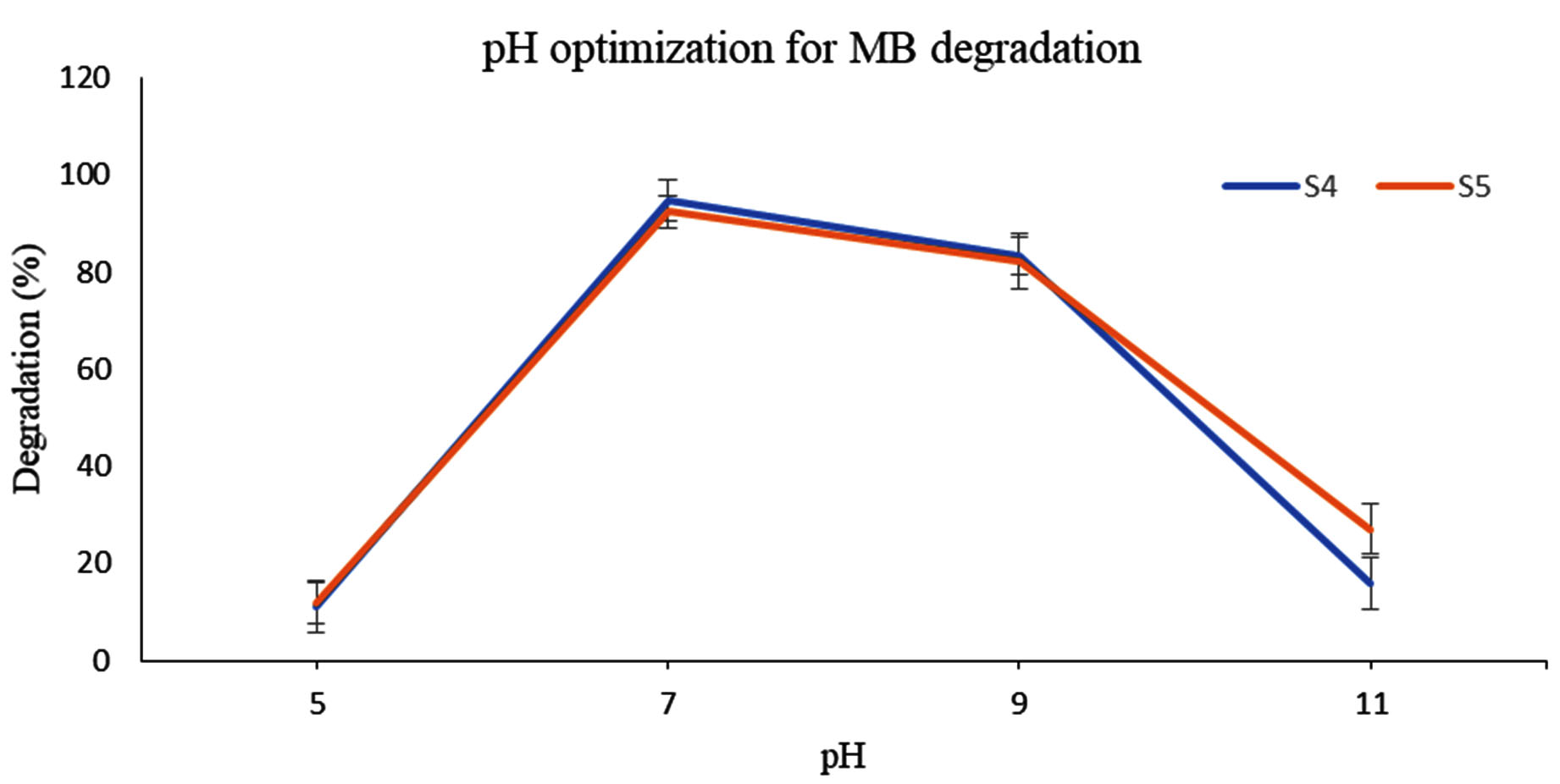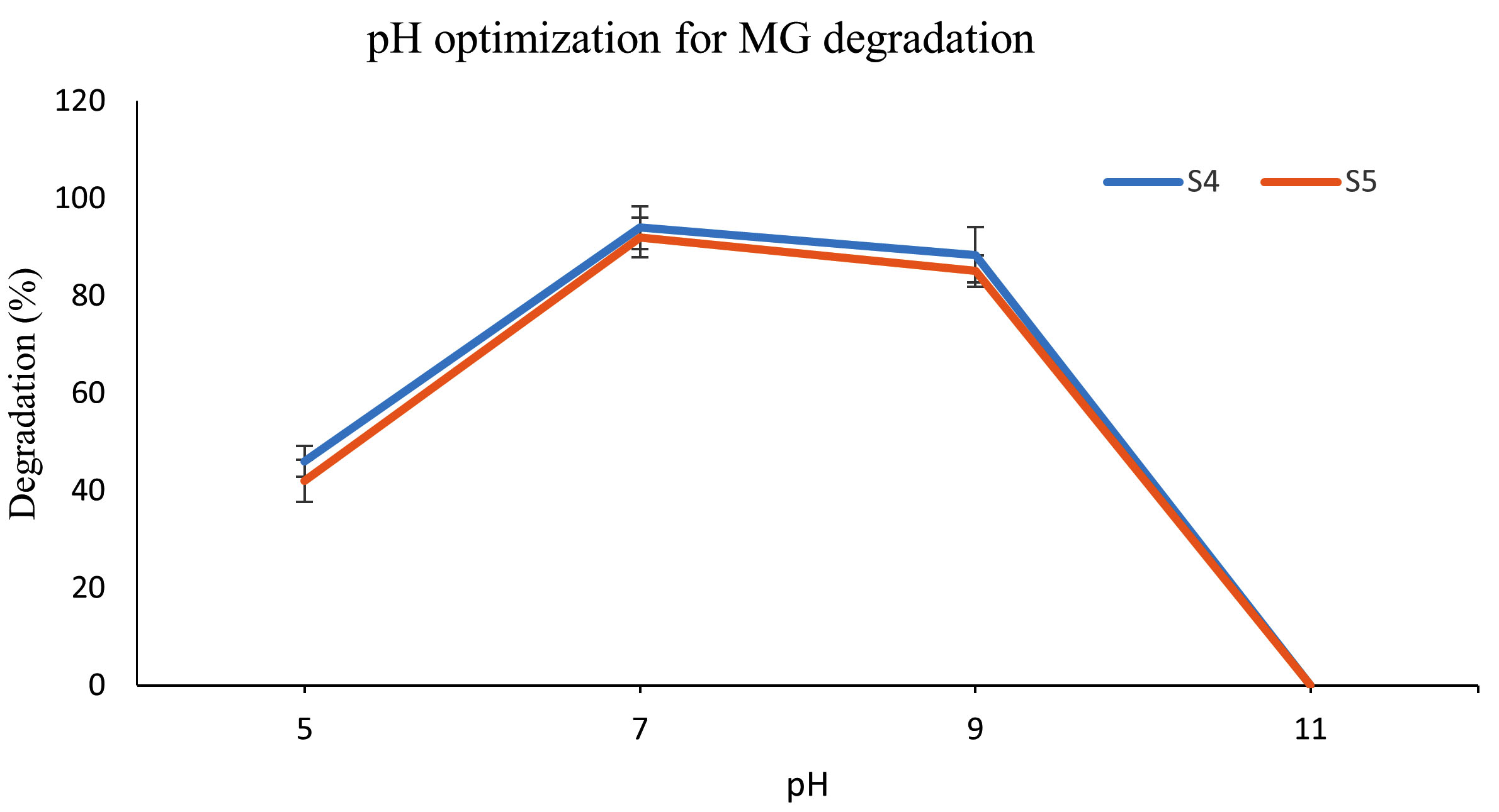 Temperature and pH parameters were tested to determine the optimum culture conditions desirable for effective decolourization of the MB and MG dyes. For the temperature optima, the bacterial strains (S4 and S5) were grown at 4 different temperatures (25, 35, 40 and 45 °C) in shaking conditions containing sterile NB. 2% inoculum from overnight grown bacterial cells supplemented with MB and MG dyes at respective temperatures were grown for 24 hours and thereafter the spectroscopic evaluation done at specific wavelengths. Similarly, for optimum pH evaluation, pH range (4, 6, 8 and 9) was taken. The different pH was adjusted using HCl and NaOH and individual bacteria with respective dyes were subjected to overnight incubation at 37 °C in incubator shaker. The following day, dye degradation was measured spectrophotometrically at respective absorption wavelengths of each dye in UV-Vis Double Beam Spectrophotometer (Shimadzu UV1800, Japan).