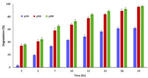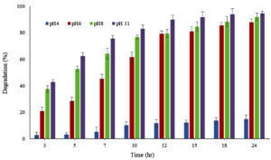 The dye degradation activity decreased when the temperature was raised above 37 °C or below. The optimal performance at 37 °C aligns with physiological adaptation of E. fergusonii and S. epidermidis which colonize warm blooded bodies. Reduced dyed degradation capability at lower temperatures (<37 °C) results from enzyme deactivation and reduced cellular metabolism. At higher temperature dye degrading enzymes are deactivated with loss in cell viability.43