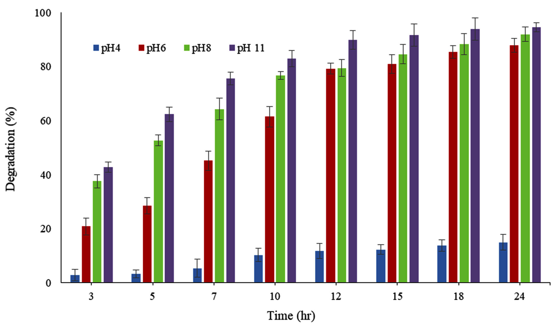 Degradation (%) = (Initial absorbance-Final absorbance) / (Initial absorbance) × 100