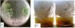 The dye degrading bacteria S4 and S5 was immobilized on Luffa to enhance the process of dye removal both by physical adsorption of LS and enzymatic decolourization by these bacterial species. The interaction between bacterial cell membrane components and the surface functional groups like carboxyl (-COOH) and hydroxyl (-OH) of the matrix helped in the immobilization process. The successful immobilization through static incubation in NB media was demonstrated in the NA plate where the LS displayed bacterial growth after 37 °C incubation for 24 hours (Figures 5a,b).