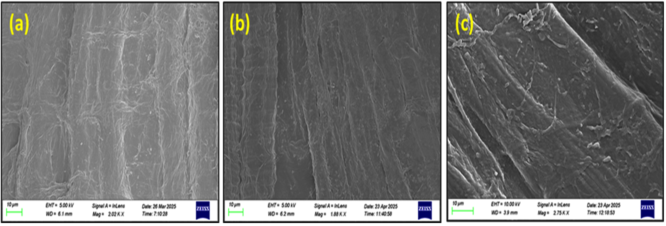 Prior to dye adsorption, the unimmobilized Luffa displays network of long fiber which are uneven and non-uniform (Figure 6a). The uniform distribution of S4 and S5 bacteria across the LS was visible and cell morphology revealed rod shaped S4 bacteria (Figure 6b) and cocci shape of S5 (Figure 6c). Attachment and bacterial spread over the complete uneven surface area of LS are crucial factors for effective biosorption of MG and MB dyes. The firm attachment of bacterial cells to the fibrous network of the LS can be credited to the existence of different functional groups like carboxyl, hydroxyl and amino in the matrix surface. Concurrent studies by Zainab et al.47 also demonstrated LS as an excellent surface carrier for adhering methanogens and their biofilm.